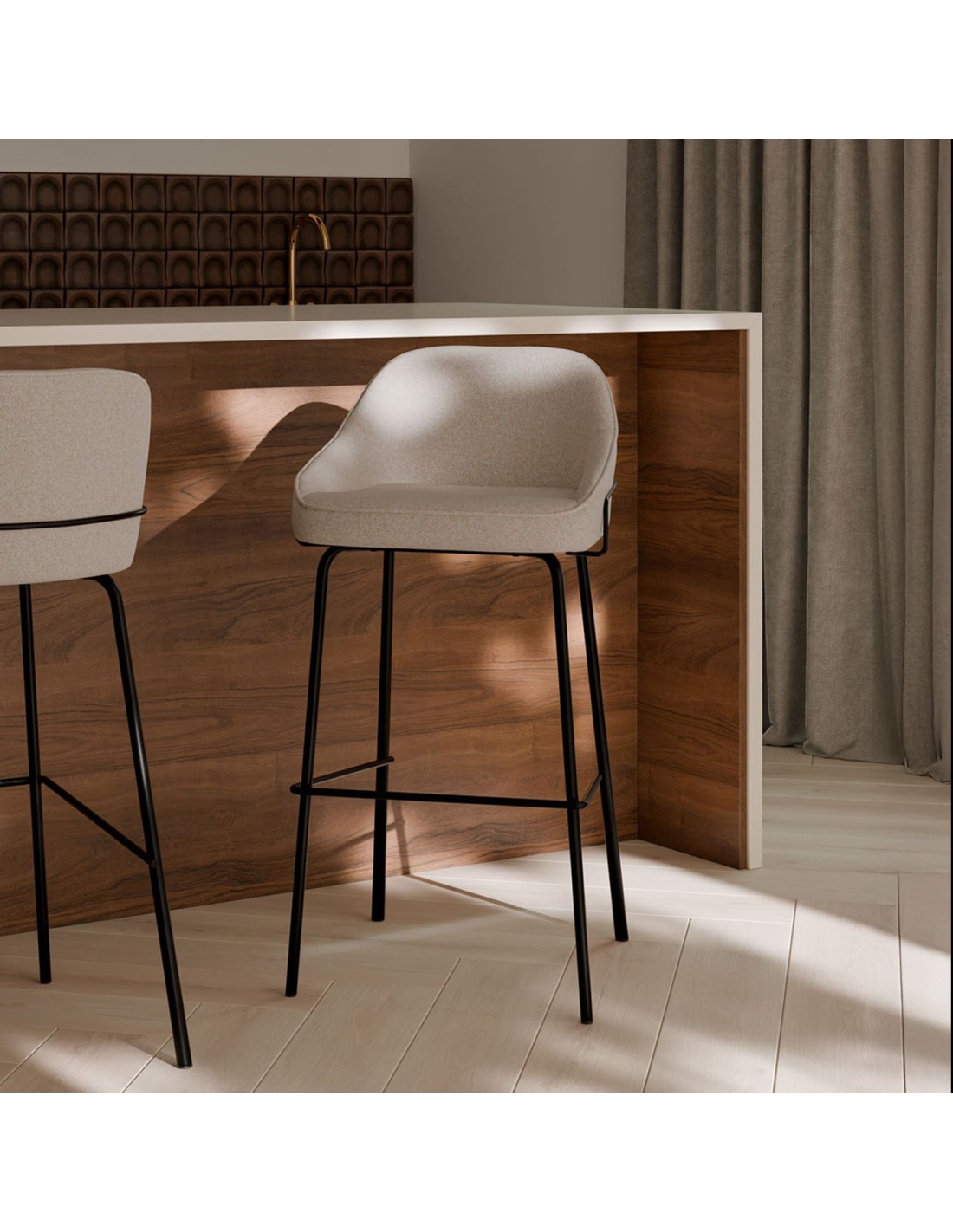 Este taburete alto es ideal para cocinas o bares, gracias a su diseño minimalista y elegante. El asiento está tapizado en tela de color beige (100% poliéster), proporcionando un tono neutro y sofisticado. La estructura y las patas de metal añaden un toque moderno y resistente. El taburete alto ROBAG se distingue por la integración de su respaldo con los reposabrazos, ofreciendo una comodidad y soporte adicionales que lo hacen perfecto para largas sesiones de uso.