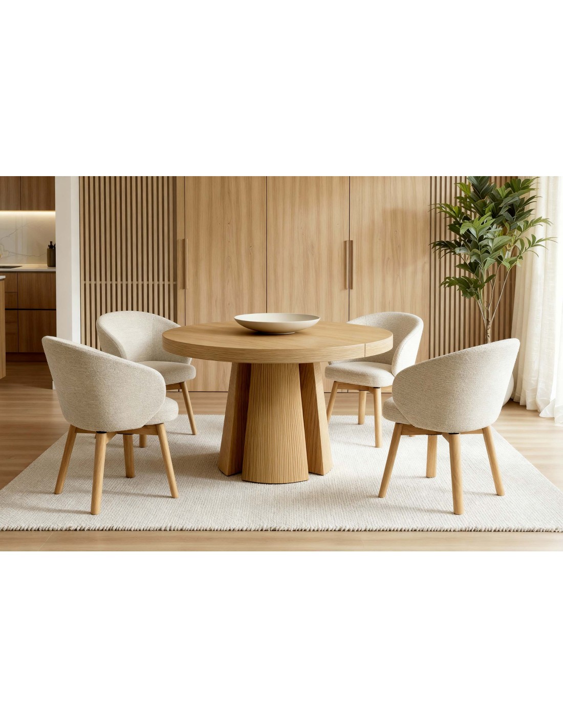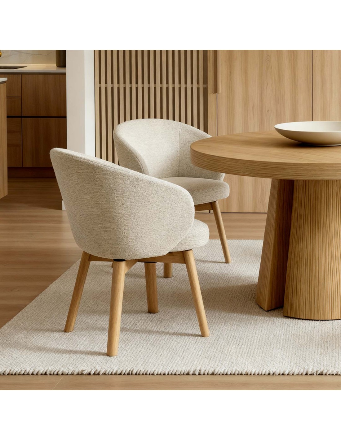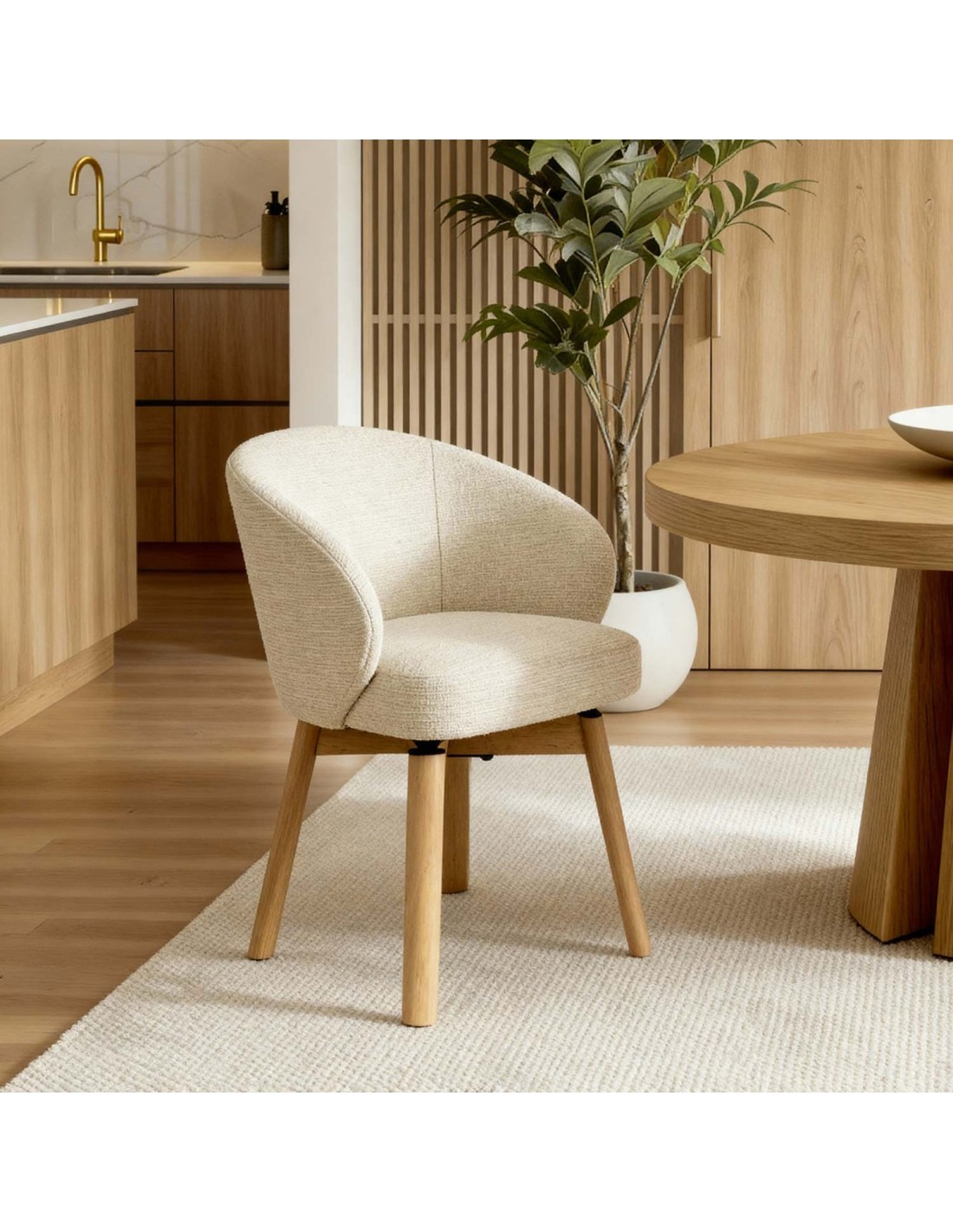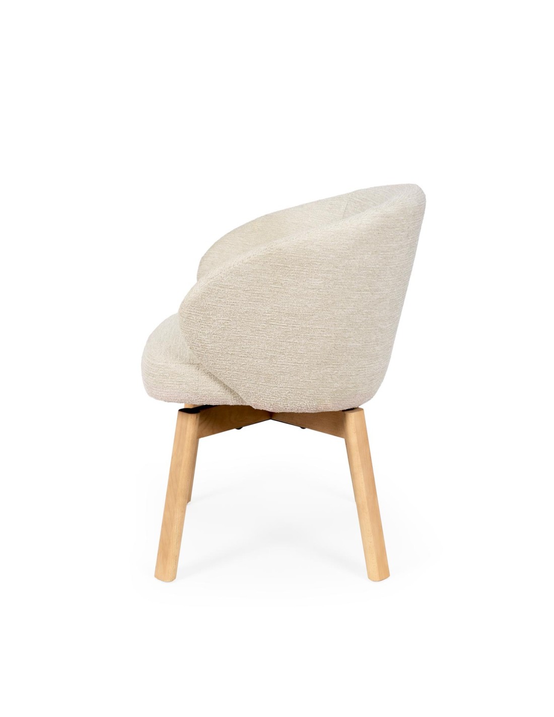 La silla NOREL es la definición de calidez moderna. Su diseño envolvente y acogedor se alza sobre unas elegantes patas de madera de haya, cuya tonalidad natural añade un toque orgánico y atemporal al conjunto. Disponible en una paleta cuidadosamente seleccionada —beige, verde, taupe y terracota—, NOREL se convierte en una aliada versátil para múltiples estilos decorativos: desde interiores nórdicos y boho hasta espacios mediterráneos o de inspiración natural. Además, cuenta con un mecanismo giratorio con retorno de 180º, lo que permite una rotación cómoda y automática a la posición inicial, facilitando su uso diario y manteniendo el orden visual del espacio sin esfuerzo.