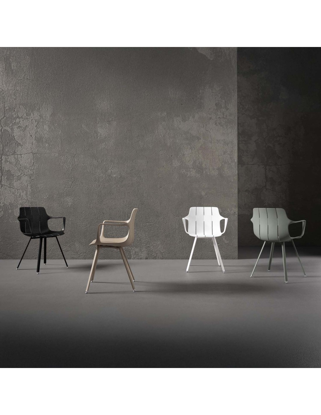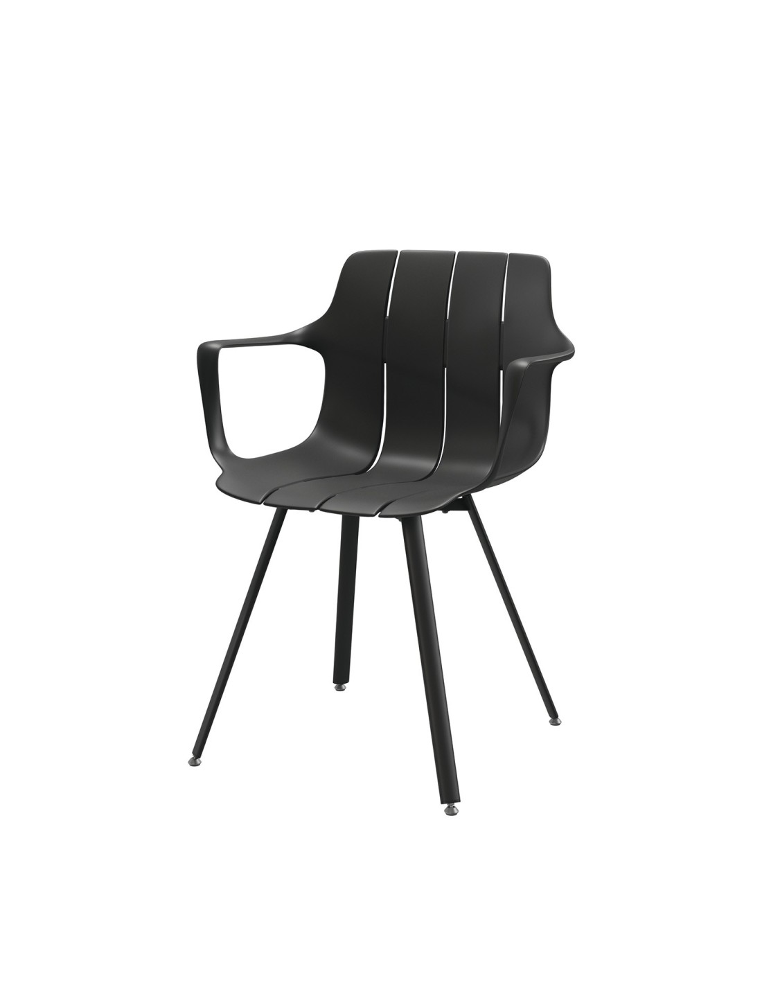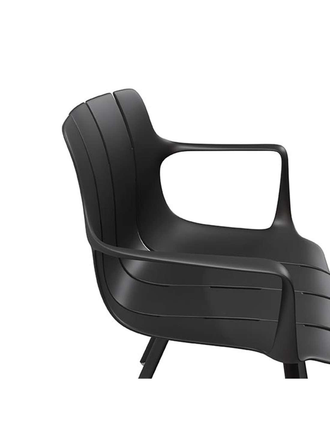La silla OMAR está formada por un asiento, respaldo y brazos moldeados en una única pieza de polipropileno, ofreciendo un soporte ergonómico que se adapta a la perfección al cuerpo. Las patas metálicas completan su diseño minimalista y moderno, ideal para cualquier espacio.