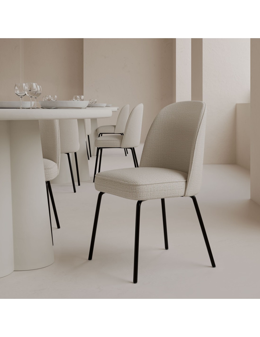 La silla WADE es ideal para su uso prolongado, gracias a su grueso acolchado tanto en el asiento como en el respaldo. El respaldo curvado se adapta perfectamente a la forma de la espalda, proporcionando un soporte ergonómico y confortable. Su diseño moderno y elegante la convierte en una opción perfecta para cualquier tipo de interior, desde comedores hasta oficinas. El tejido beige no solo añade un toque de sofisticación, sino que también es resistente y fácil de limpiar, asegurando que la silla mantenga su apariencia impecable con el tiempo.