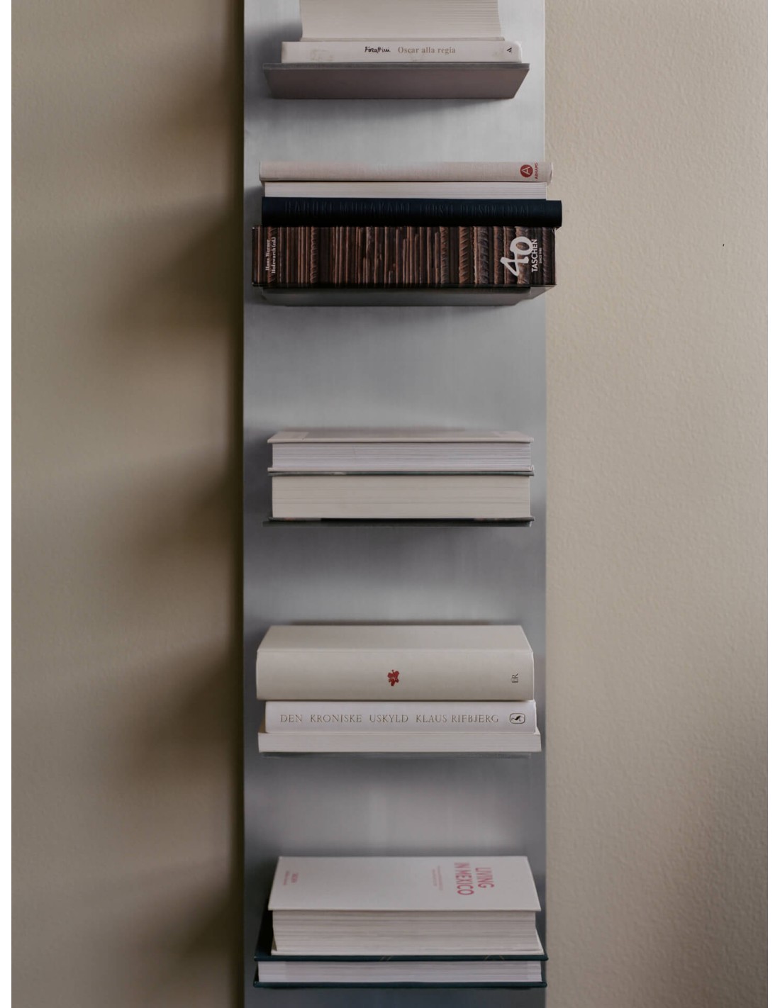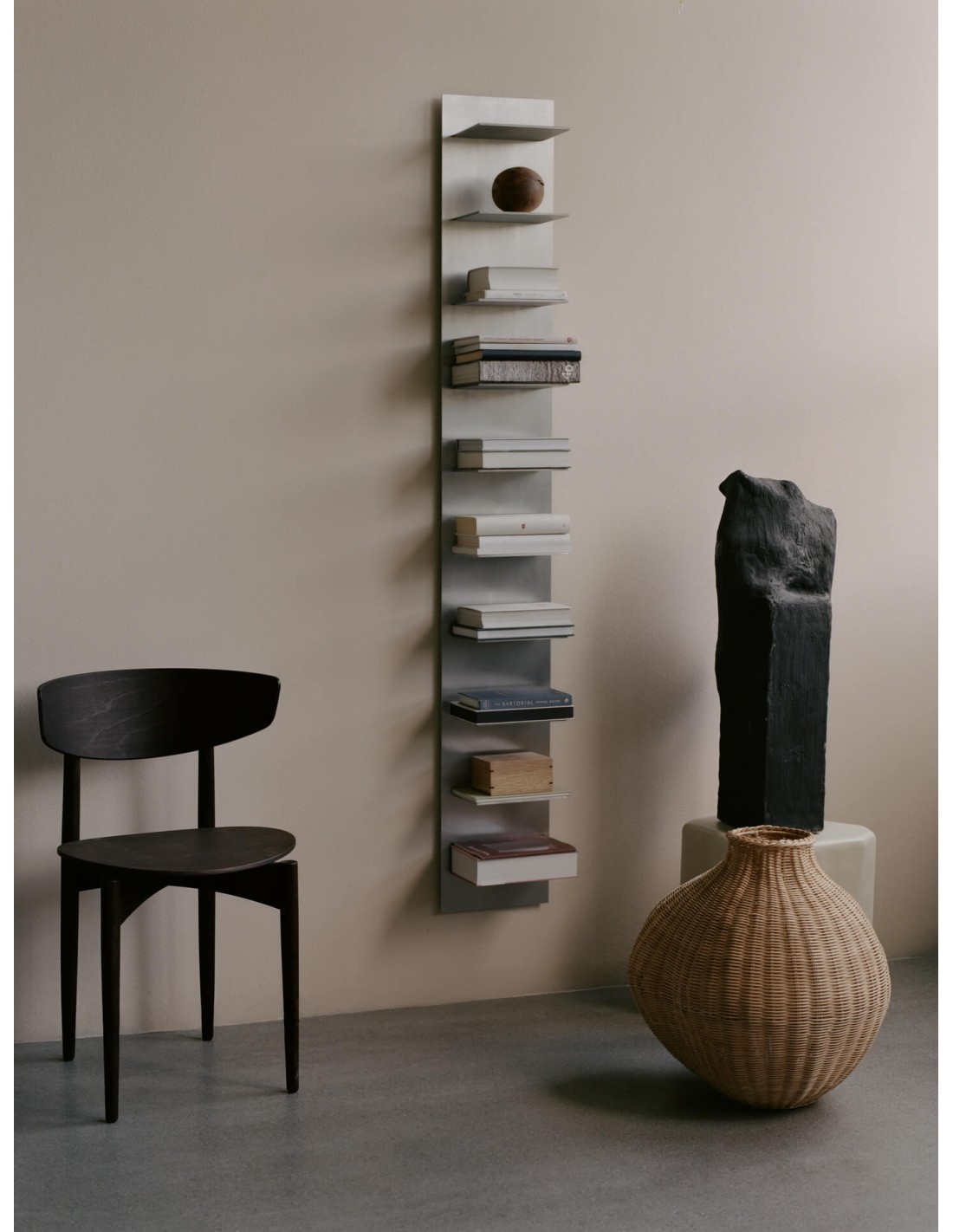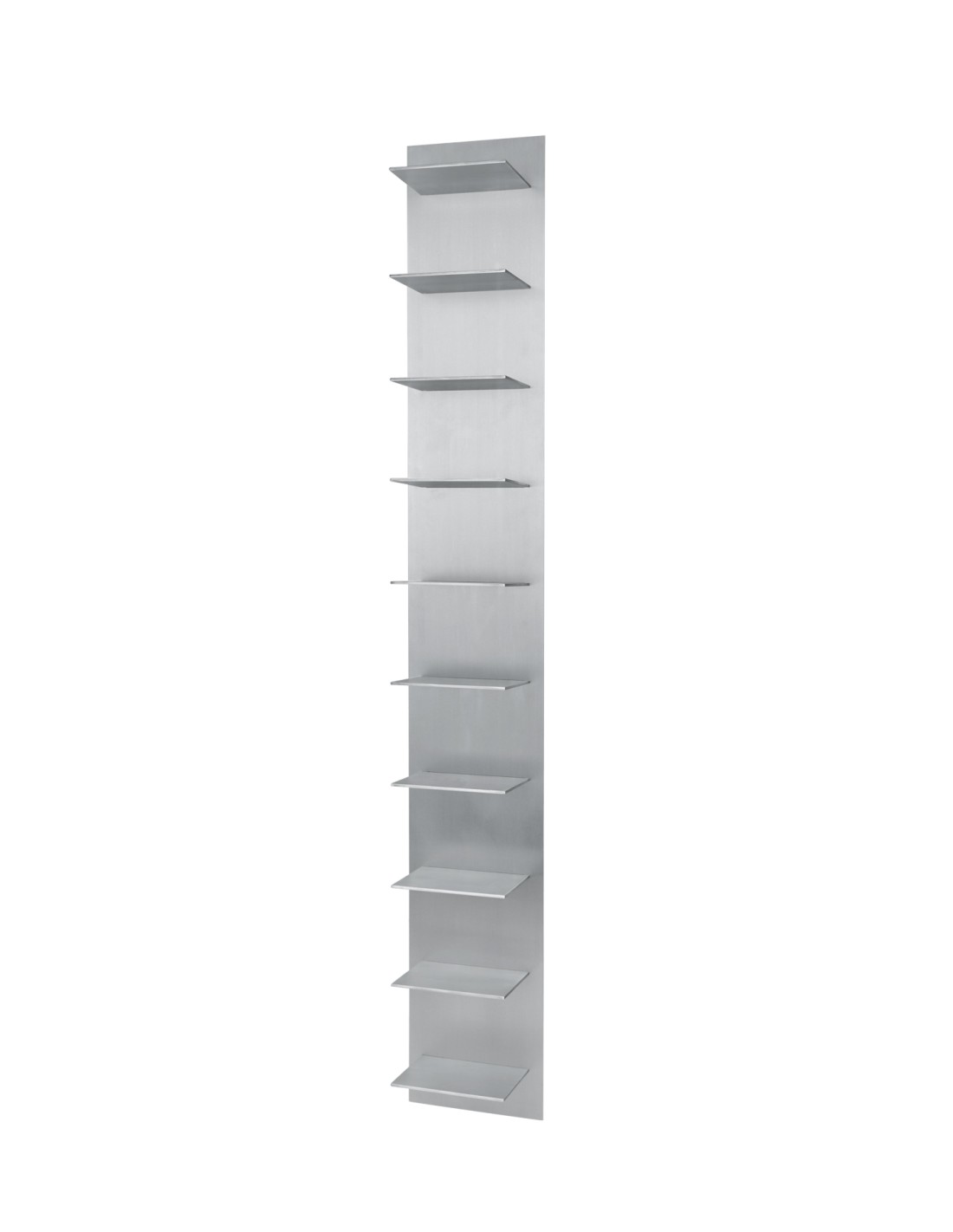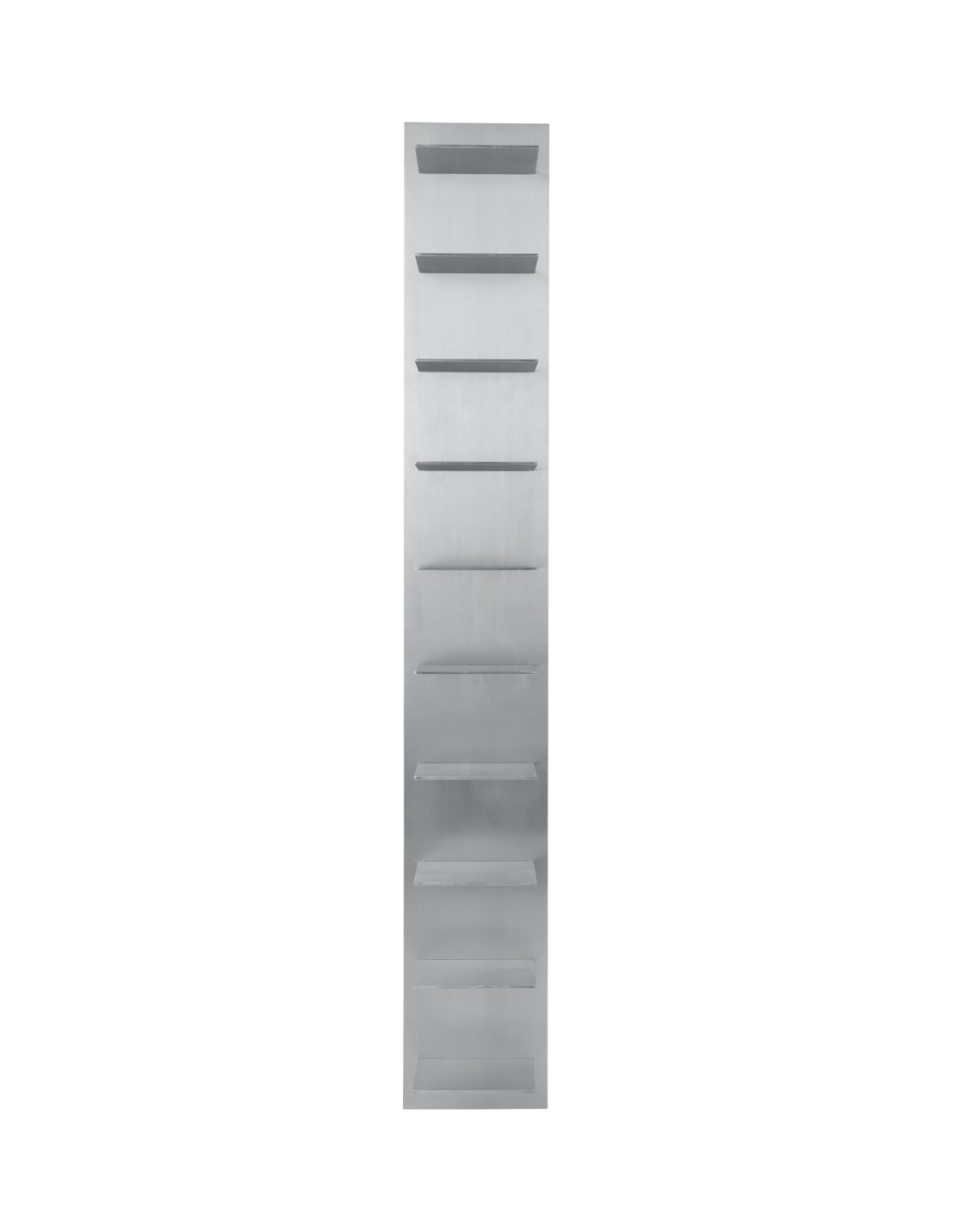 La estantería de pared Lager, en su formato vertical alto con nueve estantes, ofrece un concepto limpio y práctico de almacenaje de la pared. Fabricado en aluminio cepillado con sutiles detalles industriales, es una solución de almacenaje elegante y alargada, perfecta para libros, objetos decorativos y cotidianos. Se puede apilar fácilmente con otros estantes para crear una composición personalizada.