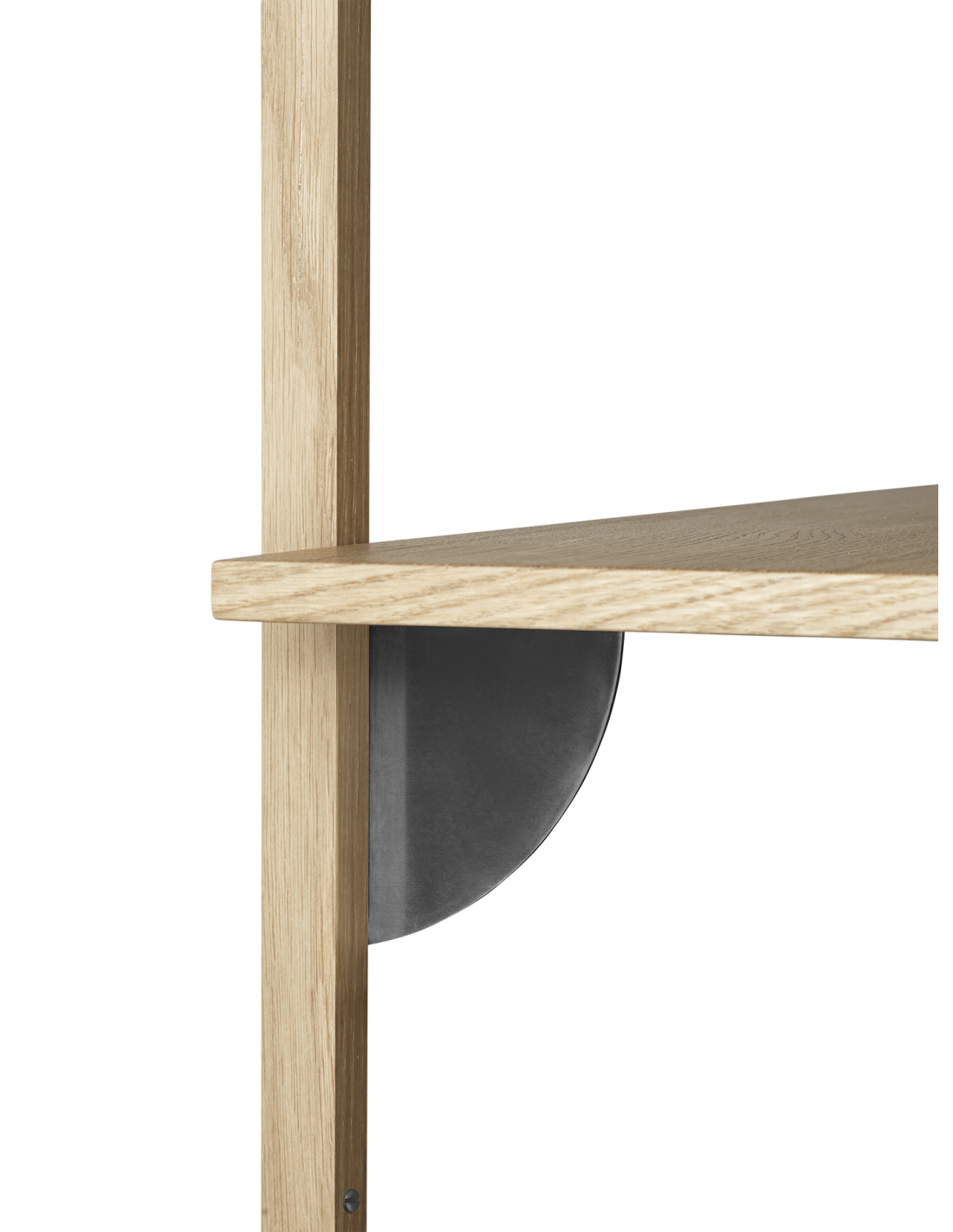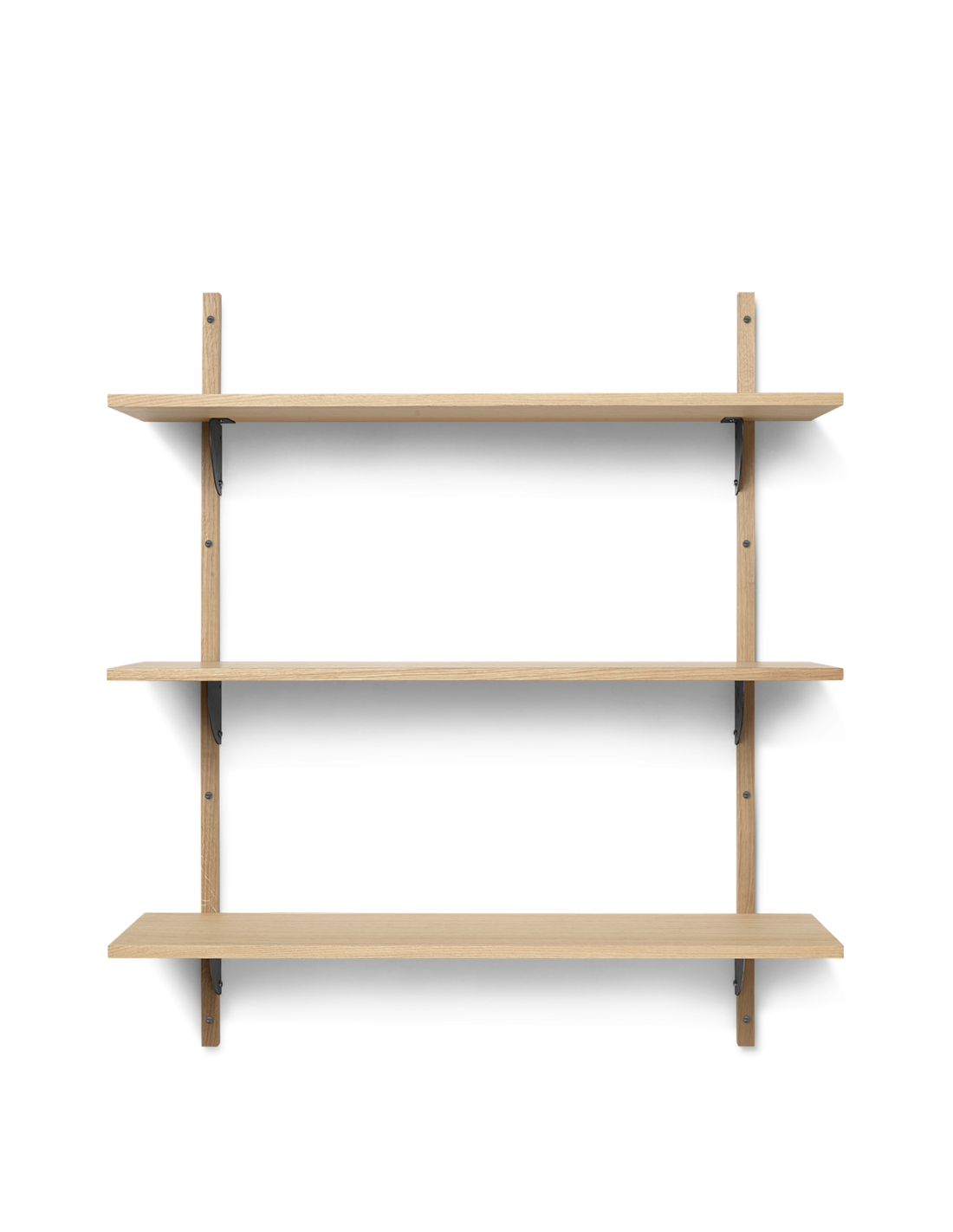 Materiales: Estantes: Chapa de roble natural con núcleo de MDF. Perfiles: Roble macizo natural. Soportes: Latón. Madera mixta con certificación FSC™.