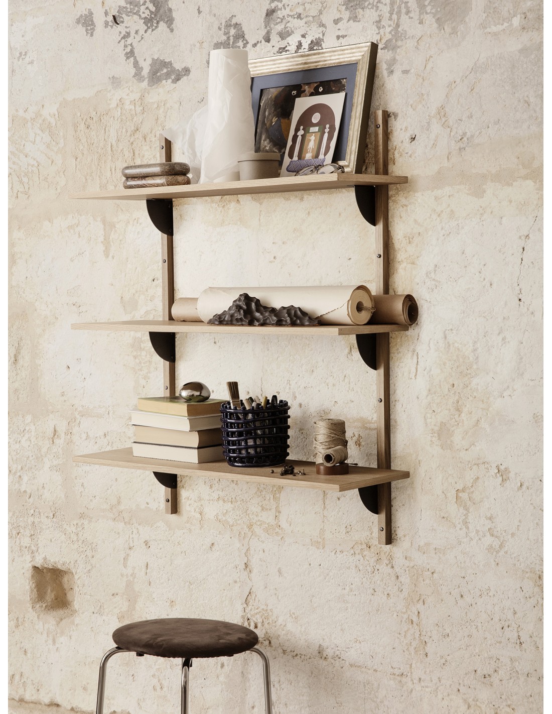 Sector, es una interpretación moderna de las estanterías de mediados de siglo, definiéndose por su robusta simplicidad y clásica combinación de madera y latón. Disponible en dos tamaños, la estantería se fija a la pared con sus correspondientes montantes de madera maciza y tornillos visibles. Úsala para exhibir tus objetos decorativos favoritos en el salón o almacenar tus objetos cotidianos y demás accesorios en la cocina.