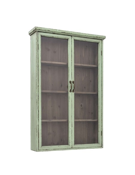 Vitrina de la línea 'Creative Collection' de Bloomingville, elaborada en madera de abeto y MDF acabado pintura verde desgastada, con dos puertas de cristal traslúcido y dos asas de hierro acabado antiguo. El color llamativo y acabado envejecido de esta pieza, atrapa todas las miradas, lo que la hace perfecta para exponer objetos decorativos, plantas, libros o revistas y también para almacenar todo tipo de objetos cotidianos. Puede usarse colgada en la pared, apoyada en el suelo o sobre una mesa.