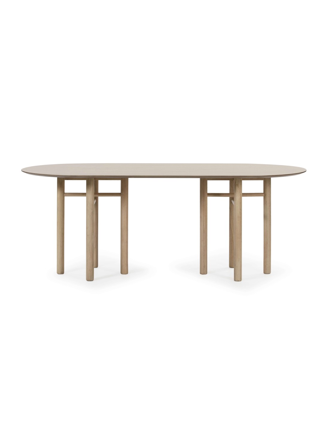 Mesa de comedor con ocho patas cilíndricas, distribuidas en dos grupos y unidas de dos en dos mediante traveseras de madera maciza. En ellas se apoya un amplio sobre ovalado con borde biselado, chapado en madera maciza de fresno acabado natural. Sus líneas estilizadas y sencillas, resaltan el valor de los procesos para su elaboración y las características naturales de la madera. Diseño exclusivo de la marca Teulat. Ideal para 8 plazas.