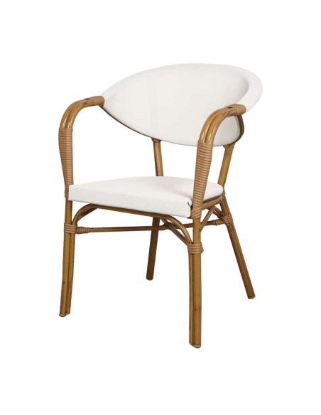 Silla exterior e interior estilo Bistro. Estructura tubular de aluminio. Acabado en imitación bambú. Asiento y respaldo en textilene.