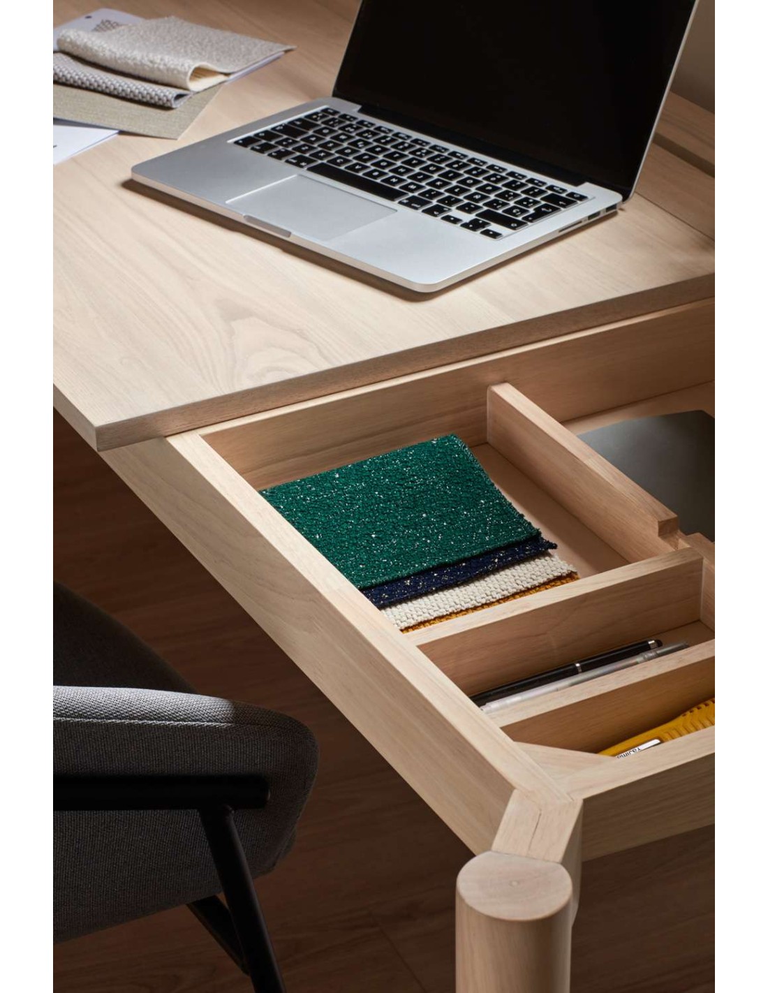 Escritorio con patas cilíndricas en madera maciza de fresno acabado natural claro y sobre chapado en fresno a tono con las patas. Un diseño robusto y resistente, que simula un equilibrio constante entre conceptos opuestos. Exclusivo de la marca Teulat.
