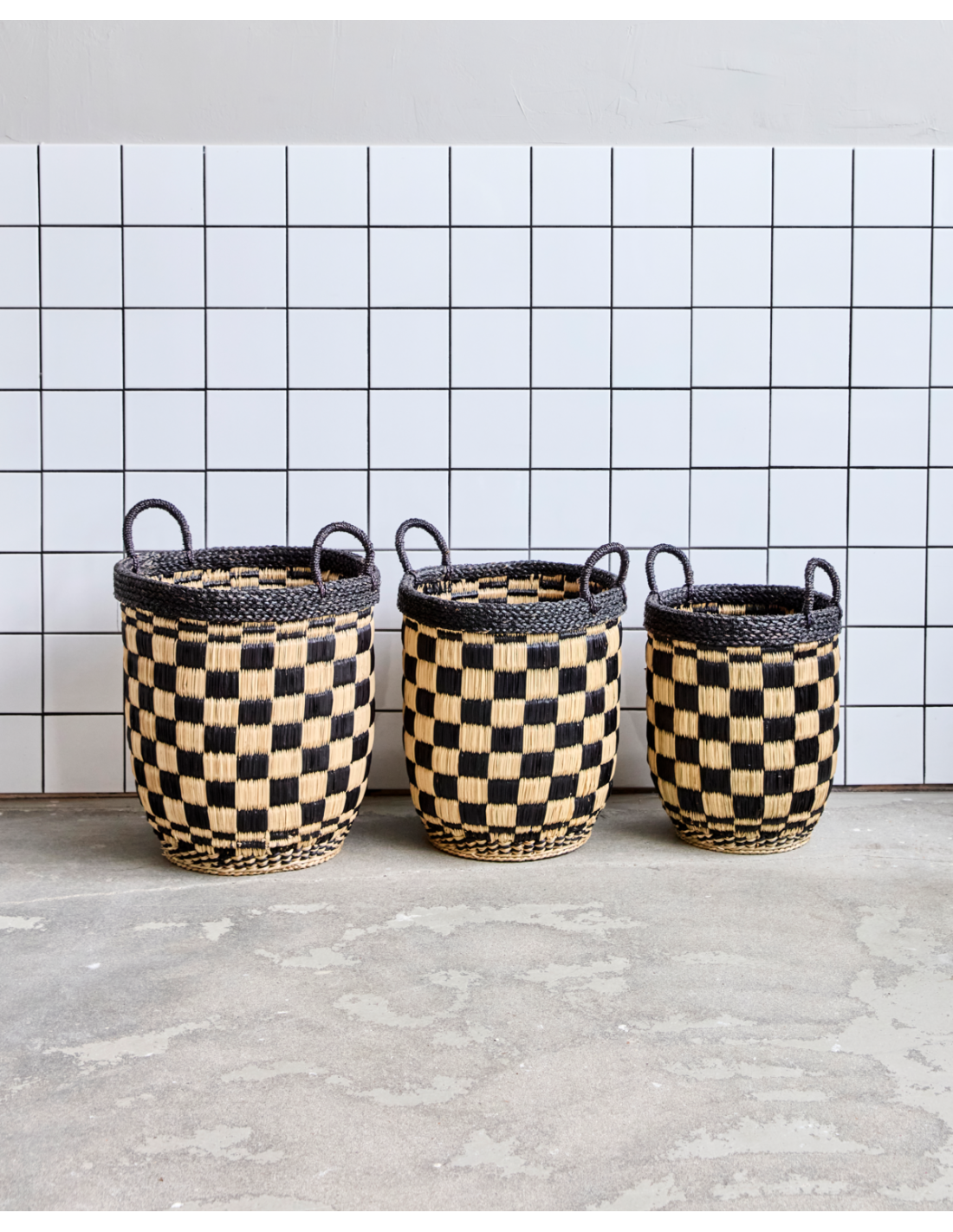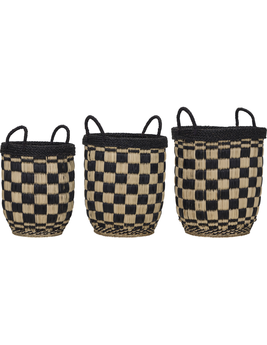 Pon orden con estilo gracias a este juego de tres cestas tejidas a mano. Su estampado de cuadros en negro y color natural aporta un toque gráfico y relajado que encaja en cualquier estancia de tu casa.- Juego de tres cestas.- Tejidas a mano con hierba marina.- Estampado gráfico de cuadros.- Almacenaje funcional y decorativo. Limpiar con un paño seco para su mantenimiento.