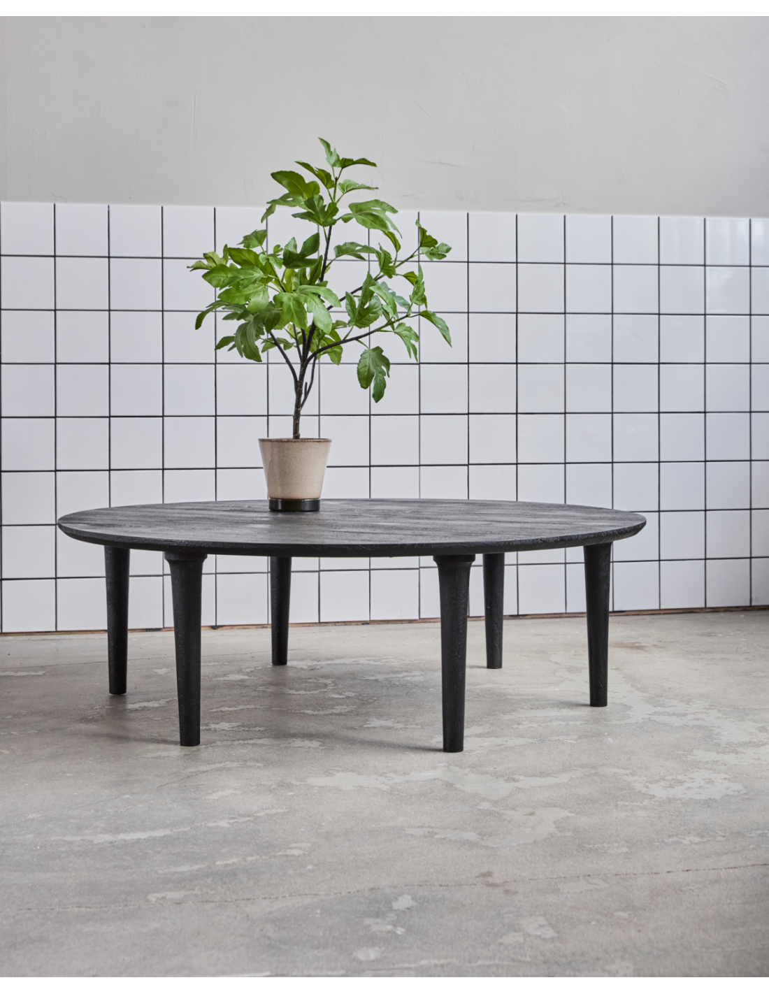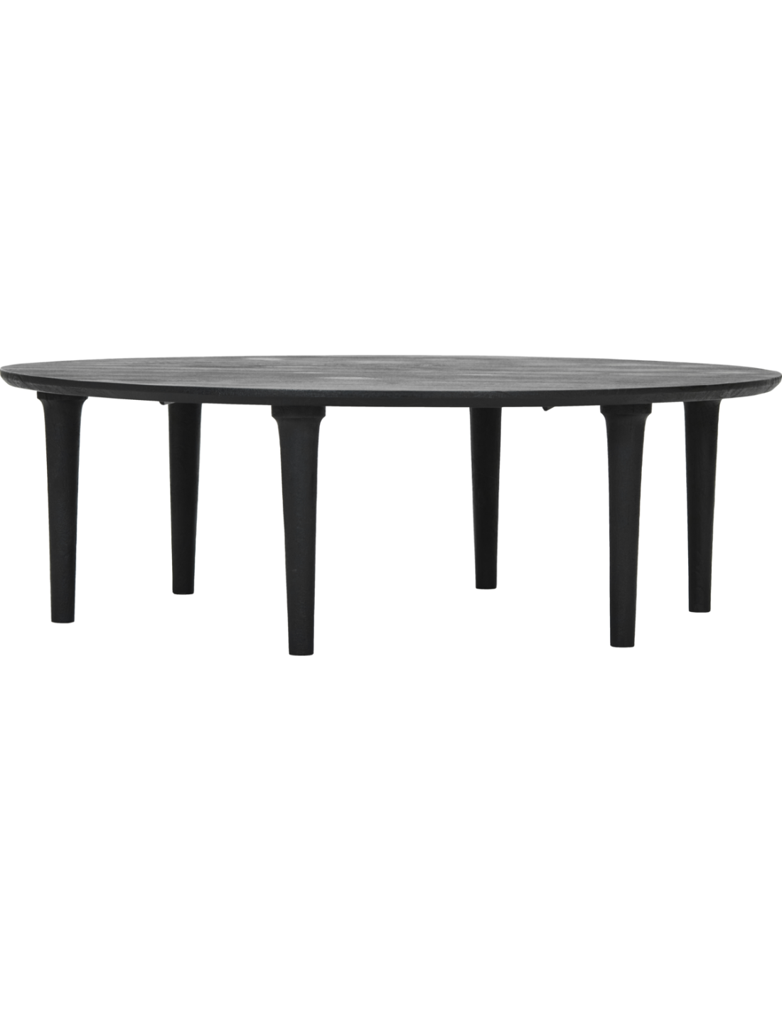 La mesa de centro HDZanzi está fabricada en madera de mango maciza con un acabado en negro mate. La forma escultural y las patas orgánicas aportan una gran profundidad visual al diseño y un toque personal a la decoración de tu salón.- Madera de mango maciza.- Superficie negra mate.- Tablero redondo. Limpiar con un paño húmedo para su mantenimiento.