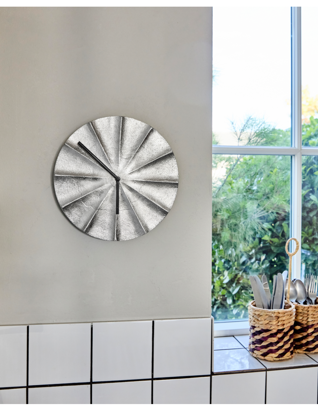 Este reloj HDShow hecho a mano es una auténtica obra de arte escultural para tu pared. Su brillante acabado plateado crea un magnífico contraste con las manecillas oscuras en tono gris metálico envejecido. Gracias a su esfera plisada, se genera un dinámico juego de luces que combina a la perfección funcionalidad y estilo moderno. Pilas no incluidas.- Acabado plateado dinámico.- Manecillas oscuras en tono gris metálico envejecido.- Requiere pilas AA (no incluidas). Limpiar con un paño seco para su mantenimiento.