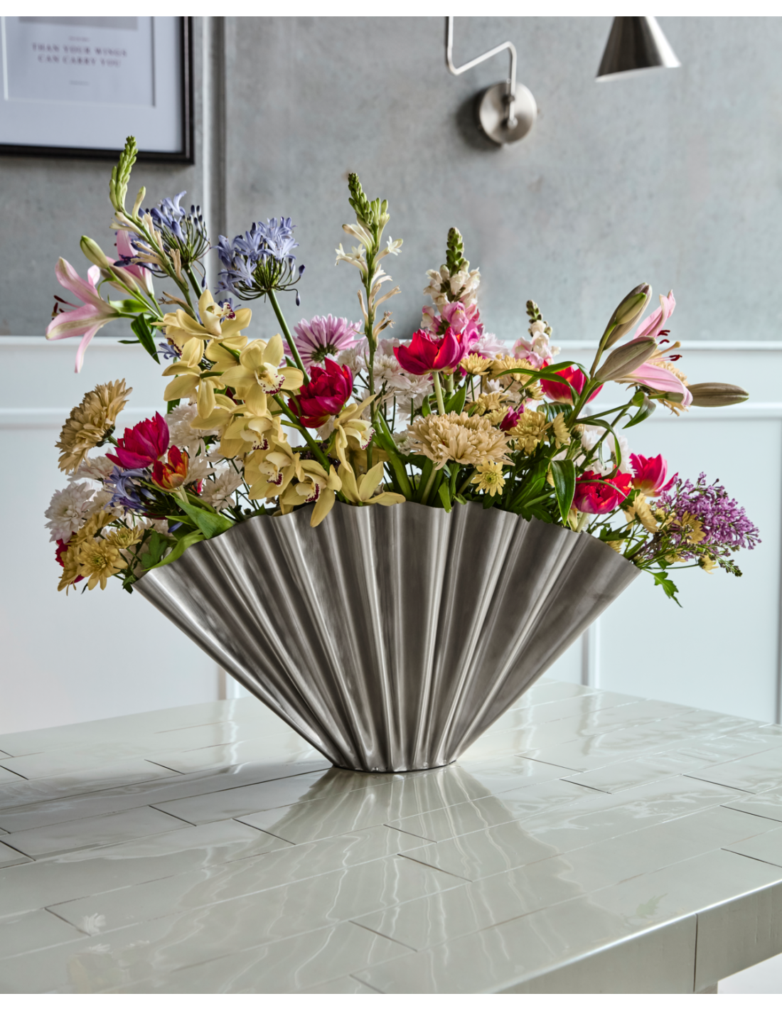 Con un acabado plateado cepillado, esta elegante y moderna pieza realza cualquier interior. Los delicados dobleces a los lados aportan movimiento y ayudan a mantener el ramo compacto y definido. Hecha a mano en hierro, ofrece carácter y sofisticación a cualquier espacio, ya sea en el salón, la entrada o un dormitorio. Ideal para flores frescas o secas y perfecta para destacar sobre una consola o estantería.- Acabado plateado cepillado.- Hierro artesanal de calidad.- Dobleces para ordenar las flores.- Toque moderno y dinámico.Haz tu decoración aún más especial con esta pieza atemporal. Limpiar con un paño seco para su mantenimiento.