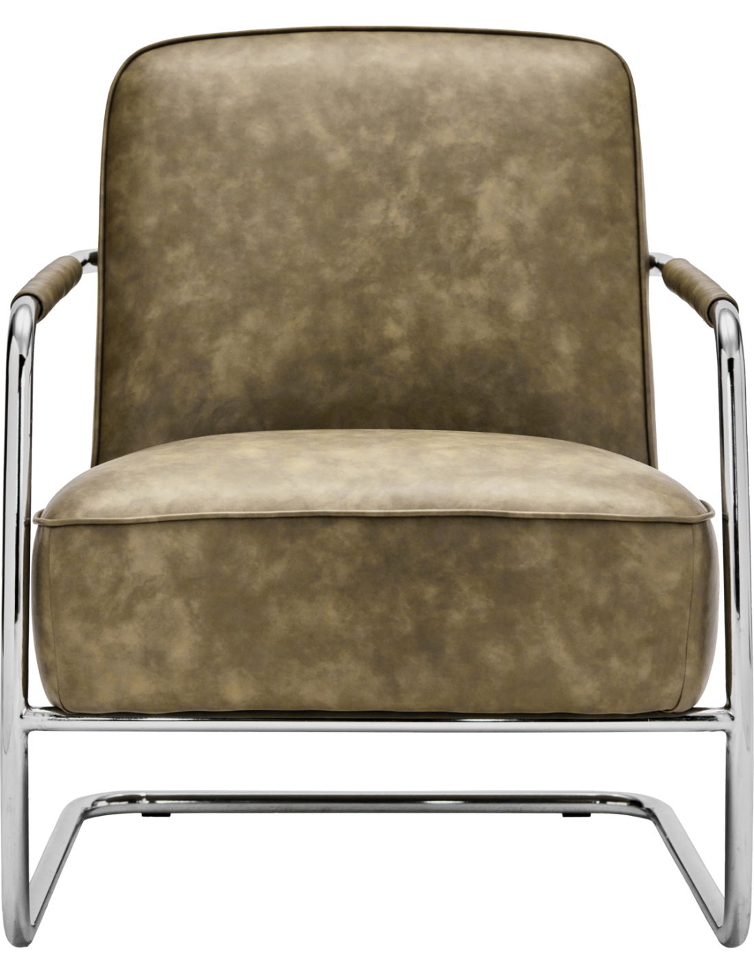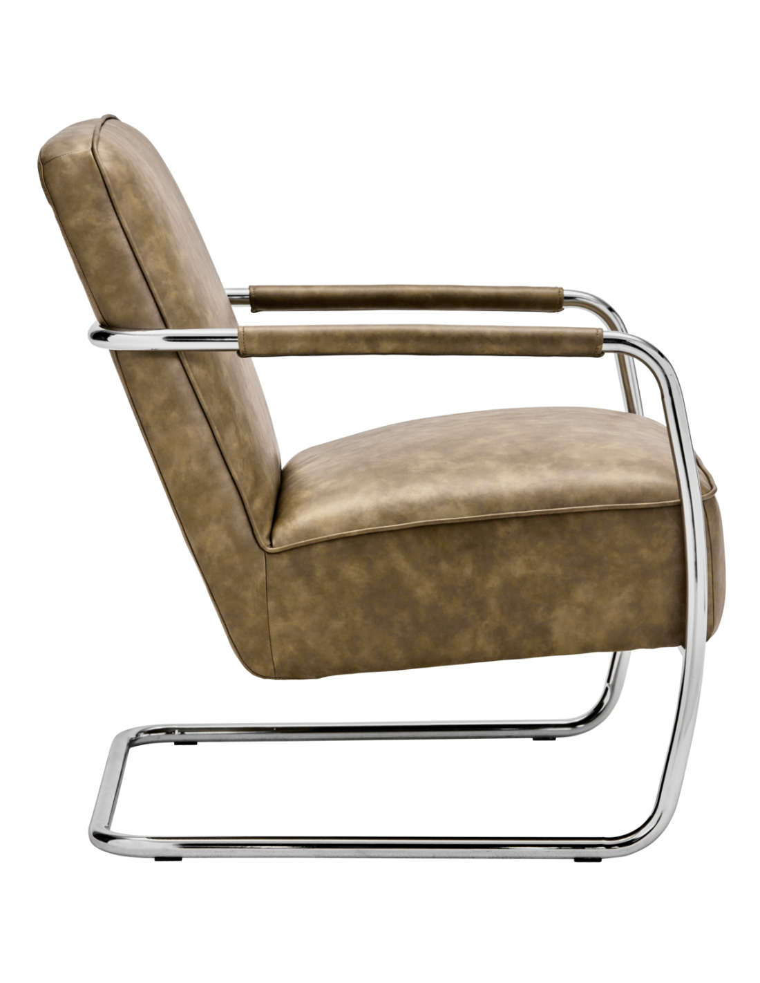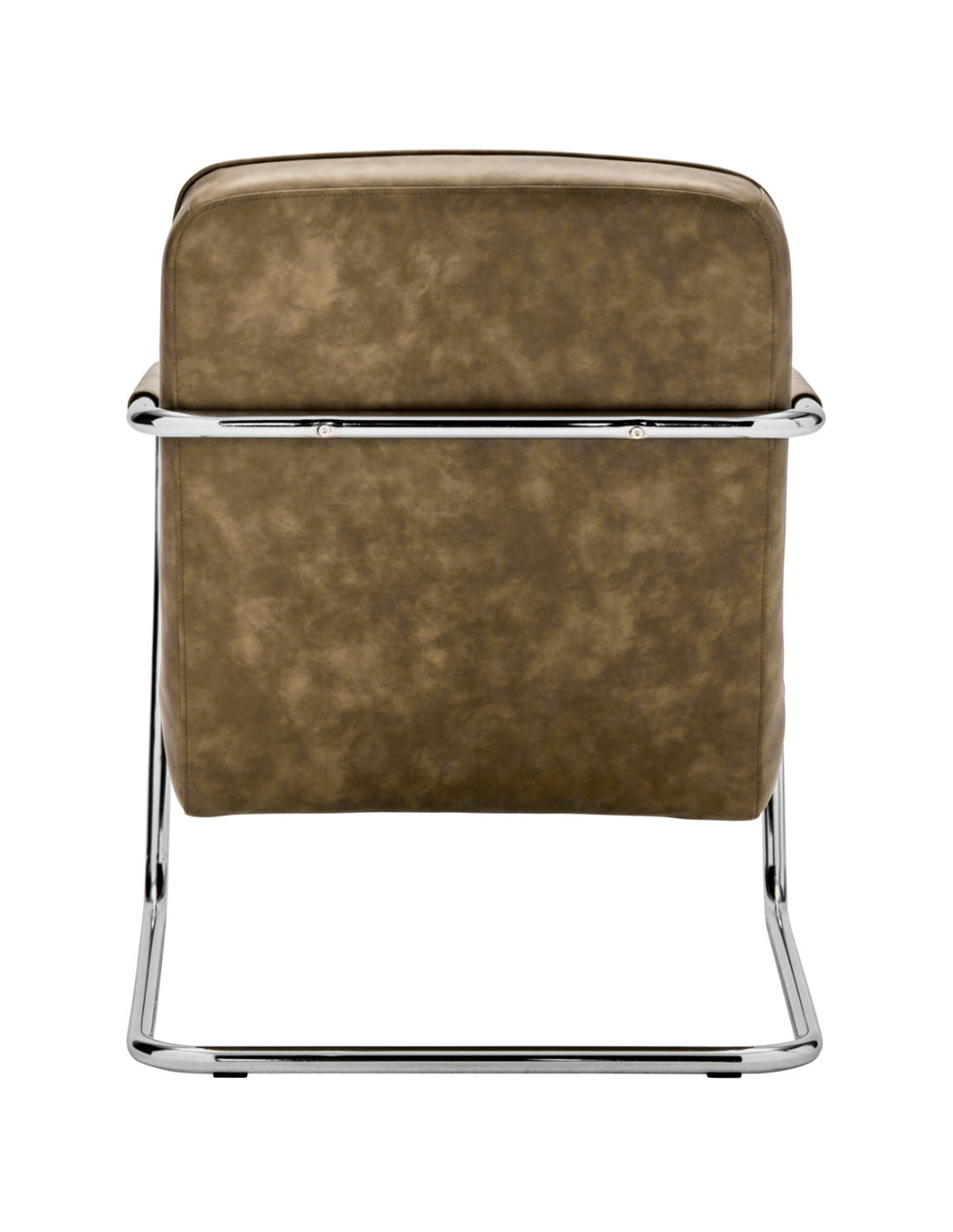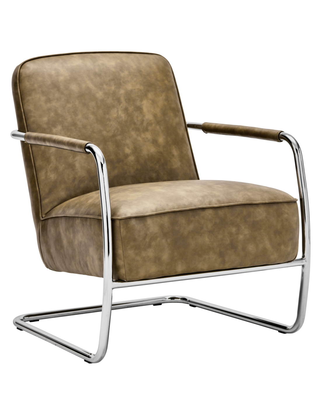 Esta butaca en color caqui combina líneas modernas y materiales de alta calidad para transformar cualquier rincón en un espacio de confort. El asiento acolchado y el respaldo tapizado en un atractivo efecto de piel invitan a largas tardes de lectura, café o relajación con estilo. El armazón de acero con acabado cromado aporta un toque vanguardista y los reposabrazos tapizados aumentan la sensación de bienestar. Disfruta de su diseño suspendido y ergonomía: cuando te sientes, no querrás levantarte.- Diseño moderno y elegante.- Efecto piel suave y cómodo.- Reposabrazos tapizados integrados.- Estructura de acero cromado.Elige sofisticación y haz que tu salón destaque con esta butaca irresistible. Requiere montaje. Limpiar con un paño seco para su mantenimiento.
