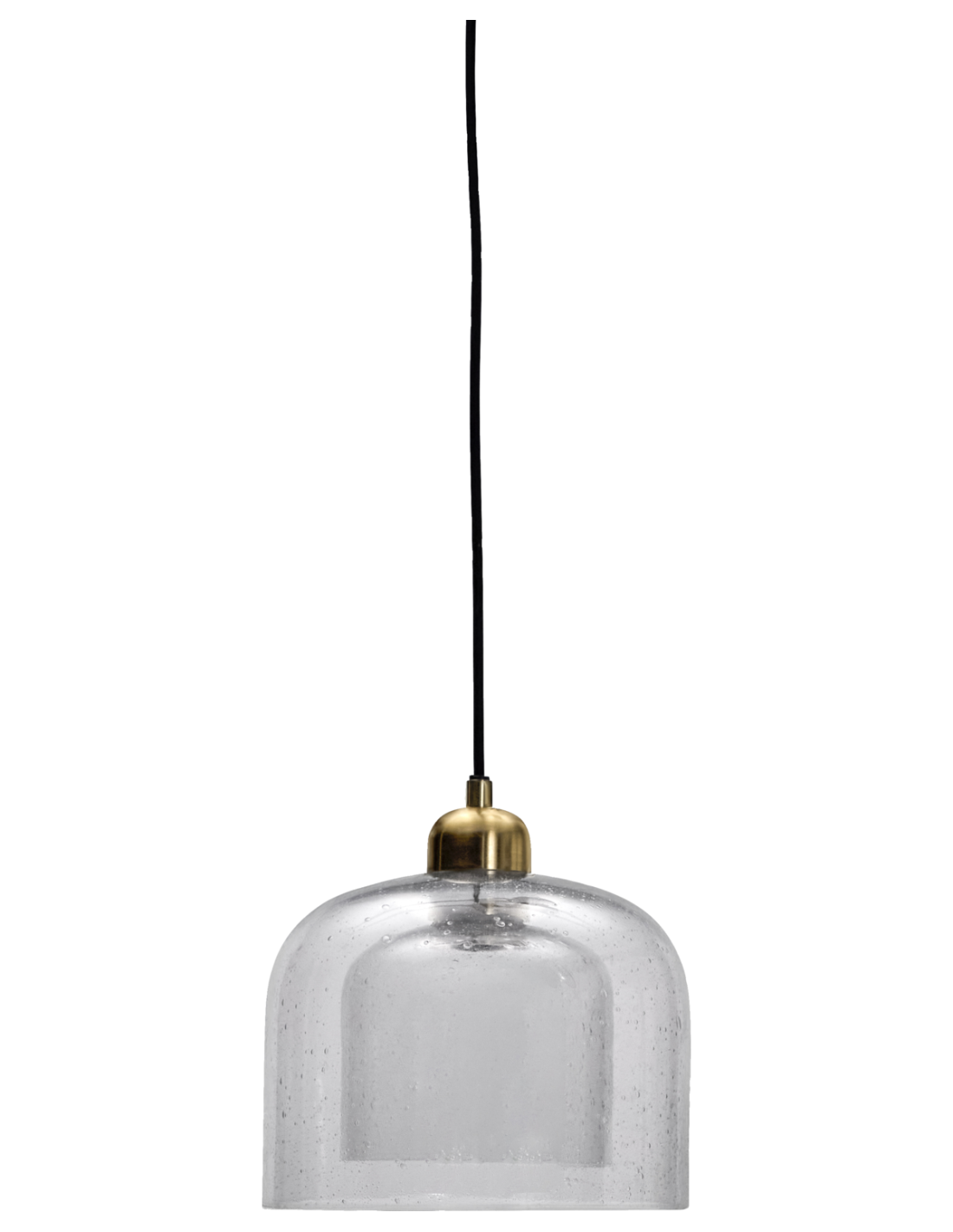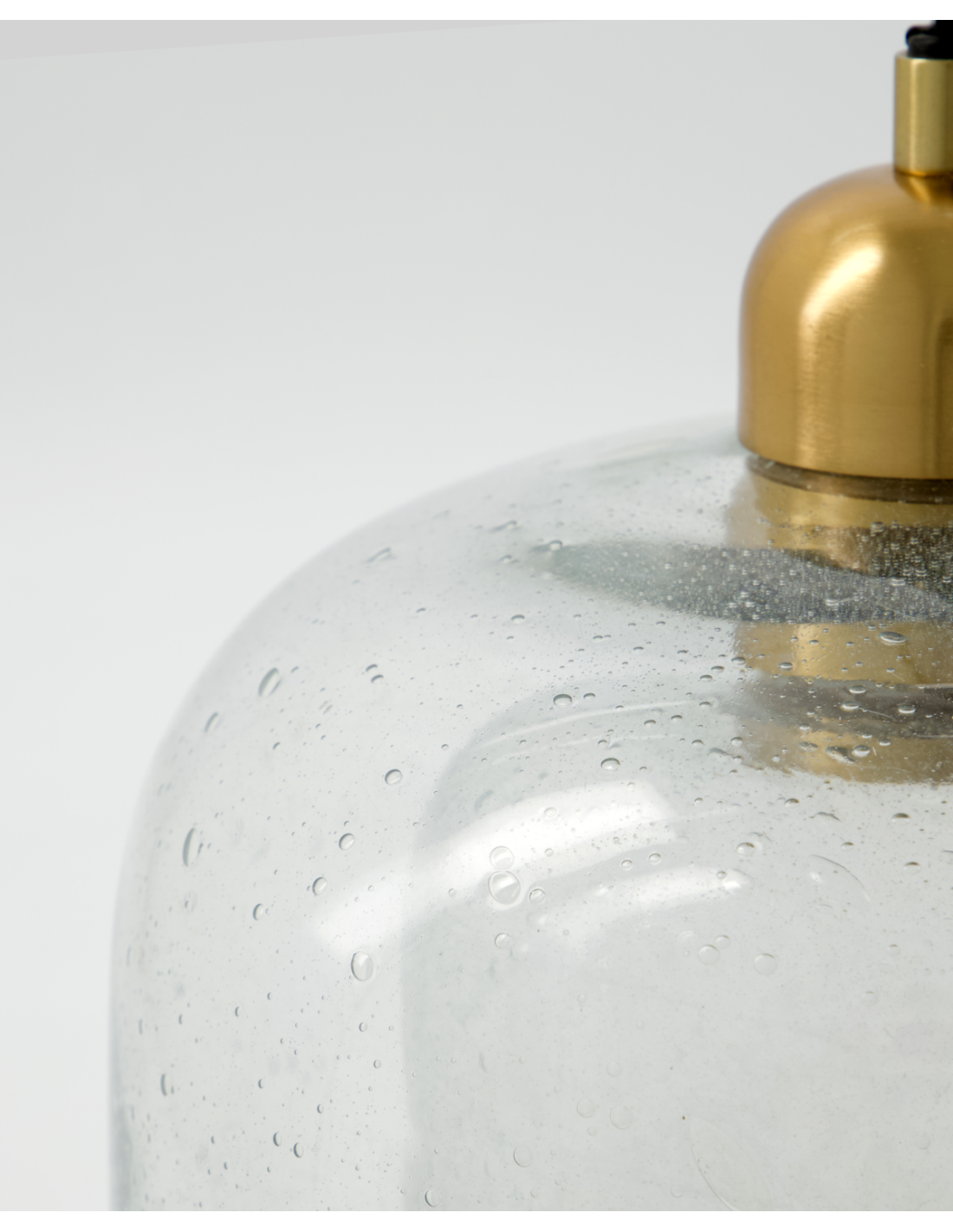 Esta lámpara colgante te envuelve con su luz cálida, gracias a su doble capa de cristal burbuja soplado a mano y elegante remate metálico en latón envejecido. Su forma orgánica añade un toque moderno y juguetón, convirtiéndose en el centro de todas las miradas ya sea sobre la mesa del comedor, en la entrada o en un rincón especial del salón.- Vidrio soplado a mano.- Detalle metálico en latón envejecido.- Look moderno y orgánico.- Destaca en el comedor o la entrada.Crea atmósferas acogedoras con este diseño escultórico y versátil. Limpiar con un paño seco para su mantenimiento.