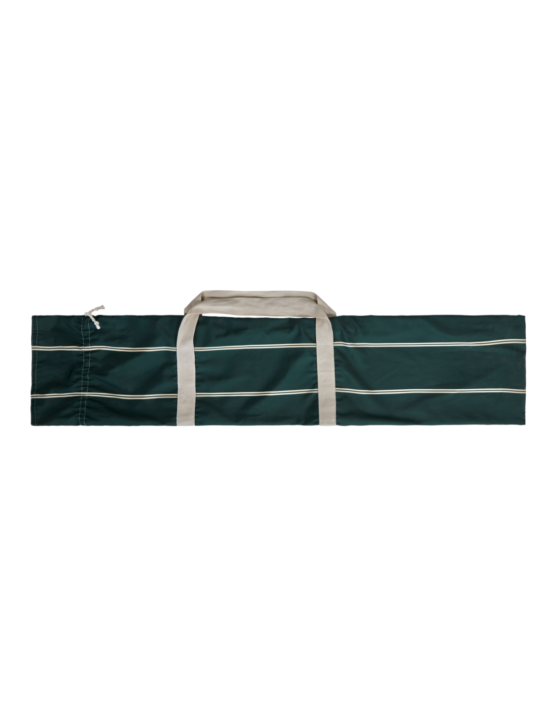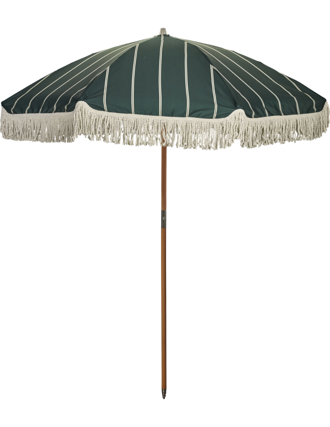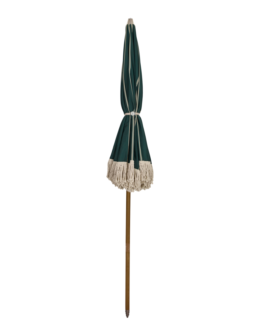Disfruta de un cálido día de verano a la sombra con esta sombrilla de jardín de House Doctor. Sus flecos largos y gruesos cohesionan las rayas beis sobre un fondo verde oscuro, aportan un toque especial y crean un look inconfundiblemente vintage. Tanto si tus muebles son de madera como de hormigón o de metal, esta sombrilla elevará el estilo general con su estética refinada. Su palo de madera puede desmontarse para guardarla en la bolsa cuando no la estés usando, lo que además te permitirá llevártela de excursión o a la playa. Requiere montaje. Limpiar con un paño húmedo para su mantenimiento.