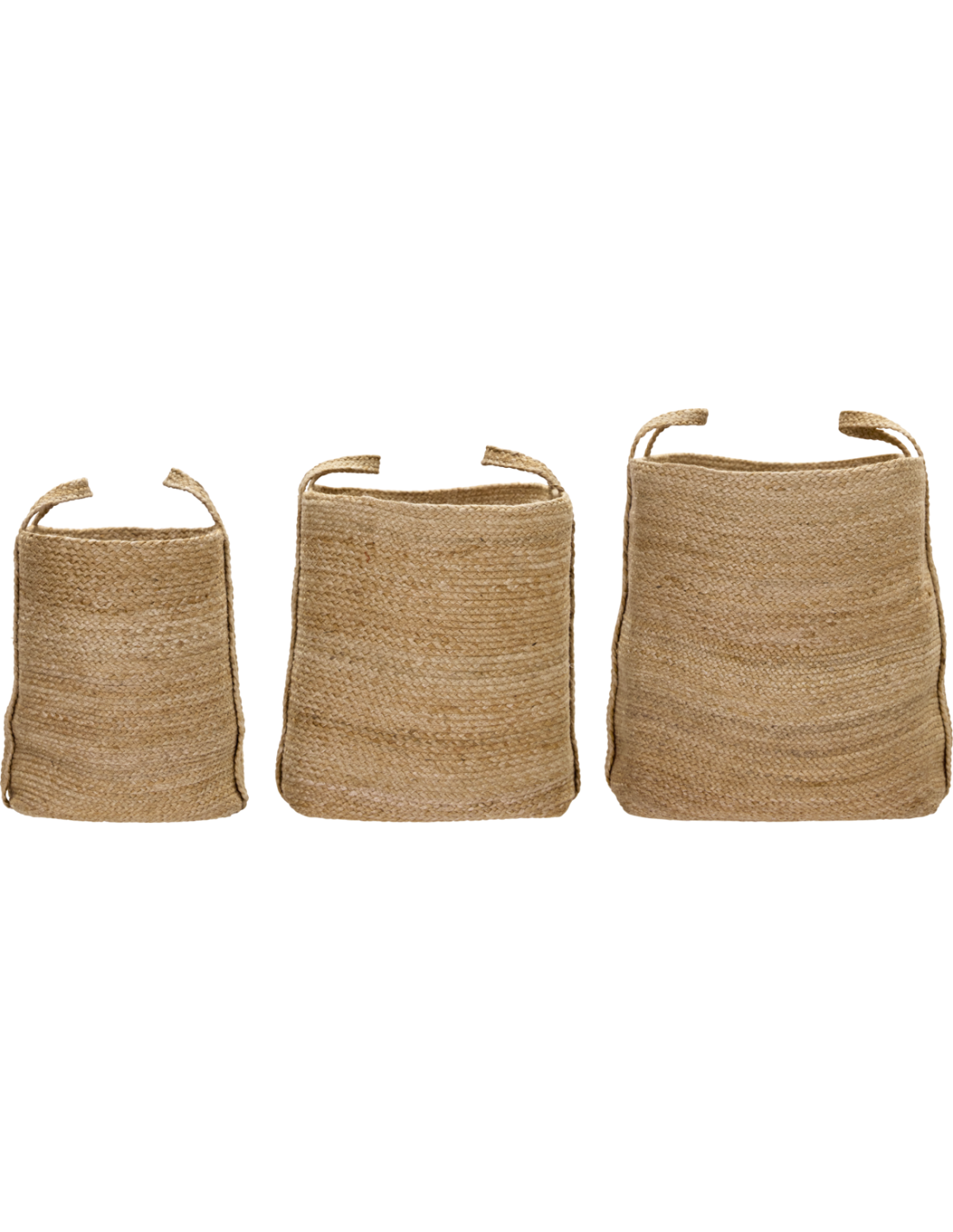 Haz que el orden también sea belleza con este juego de tres cestas de yute natural, tejidas a mano y listas para dar calidez y personalidad a tu hogar. Sus asas visibles y el tono natural hacen que llevarlas y moverlas de estancia en estancia sea fácil y decorativo. Usa una en la entrada para bufandas, otra en el baño para toallas o reserva la más grande para los peluches del dormitorio infantil. ¿Dónde las vas a colocar tú?- Yute natural tejido a mano.- Juego de 3 tamaños útiles.- Asas robustas y decorativas.- Diseño cálido y versátil.Descubre cómo el estilo y la funcionalidad pueden ir de la mano en tu día a día. Limpiar con un paño seco para su mantenimiento.