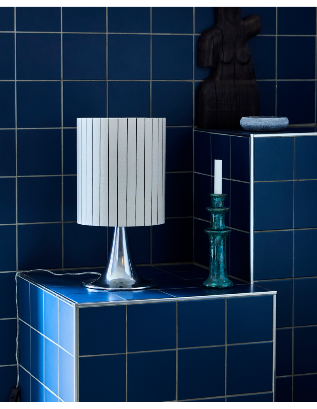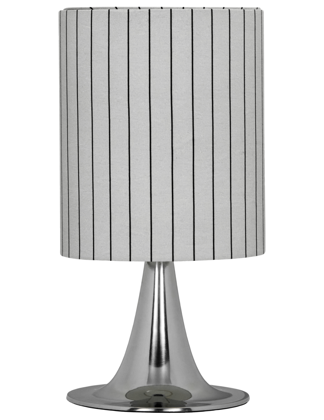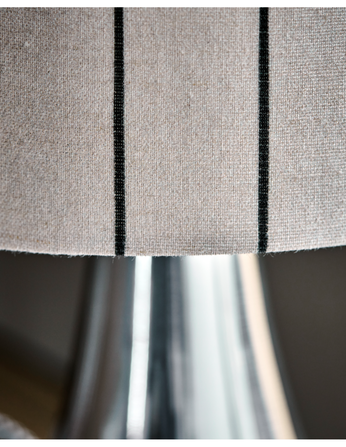 Una lámpara de mesa que realza cualquier ambiente con su original base de aluminio en acabado plateado y una pantalla textil elegante decorada con finas líneas negras. El diseño tulipán aporta un aire sofisticado y añade personalidad con discreta distinción. Llévala a una mesita de noche, una cómoda o un rincón de lectura para conseguir una luz acogedora que transforma la estancia con su presencia.- Base de aluminio refinada.- Pantalla con rayas delicadas.- Diseño tulipán distintivo.- Estilo sofisticado y versátil.Ilumina tu hogar con carácter y crea rincones únicos donde la decoración destaque. Limpiar con un paño seco para su mantenimiento.