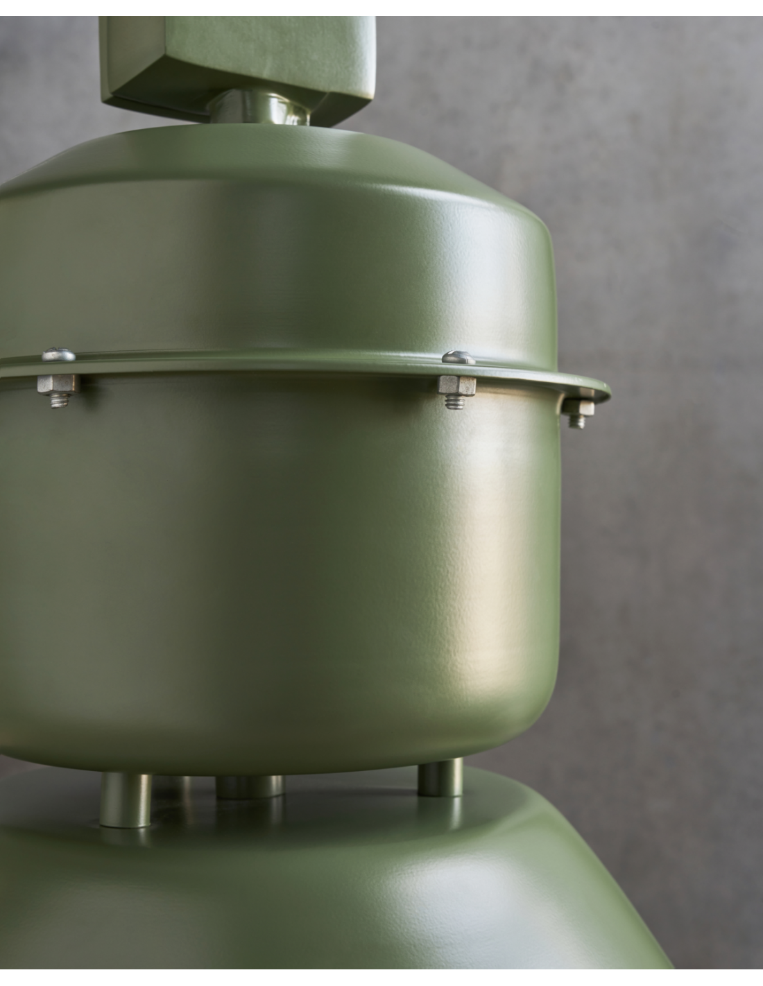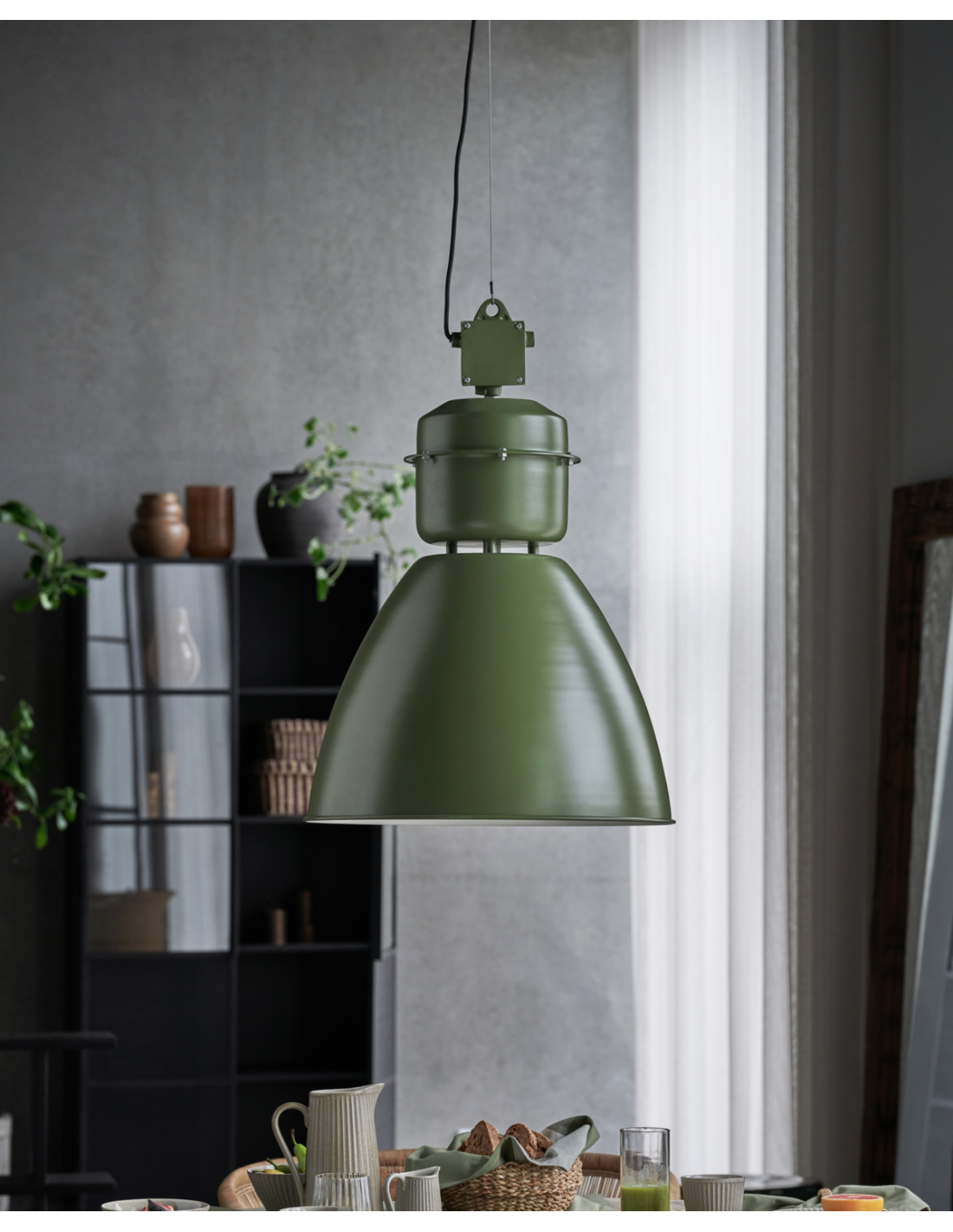 Decora a lo grande con esta lámpara de techo de House Doctor. Su gran tamaño y su aspecto industrial son ideales para la isla de la cocina o para una mesa de comedor de grandes dimensiones. Diseñada para convertirse en un punto focal que cohesione la estancia, su relajante tono verde hace que encaje bien en cualquier parte. Disfruta de la iluminación enfocada que aporta mientras cocinas o charlas con amigos alrededor de la mesa. Limpiar con un paño seco para su mantenimiento.