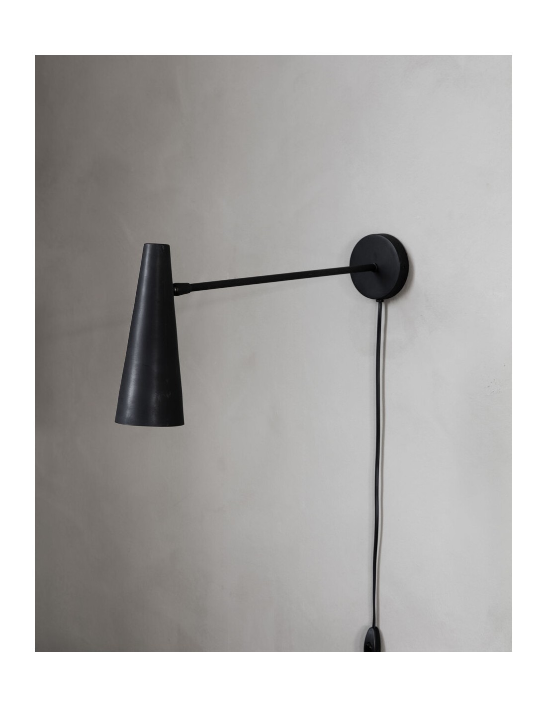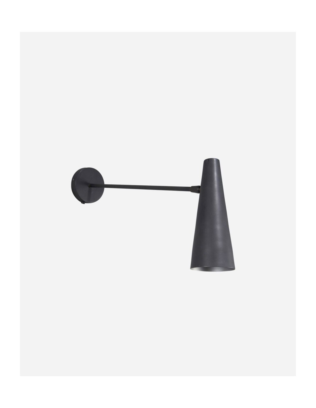 Fabricado en hierro y latón con acabado negro mate, ofrece una estética sobria y sofisticada. Su forma alargada de 47 cm proporciona una iluminación focal tipo downlight, ideal para crear un rincón acogedor junto al sofá, sobre un escritorio o como lámpara auxiliar en el dormitorio.