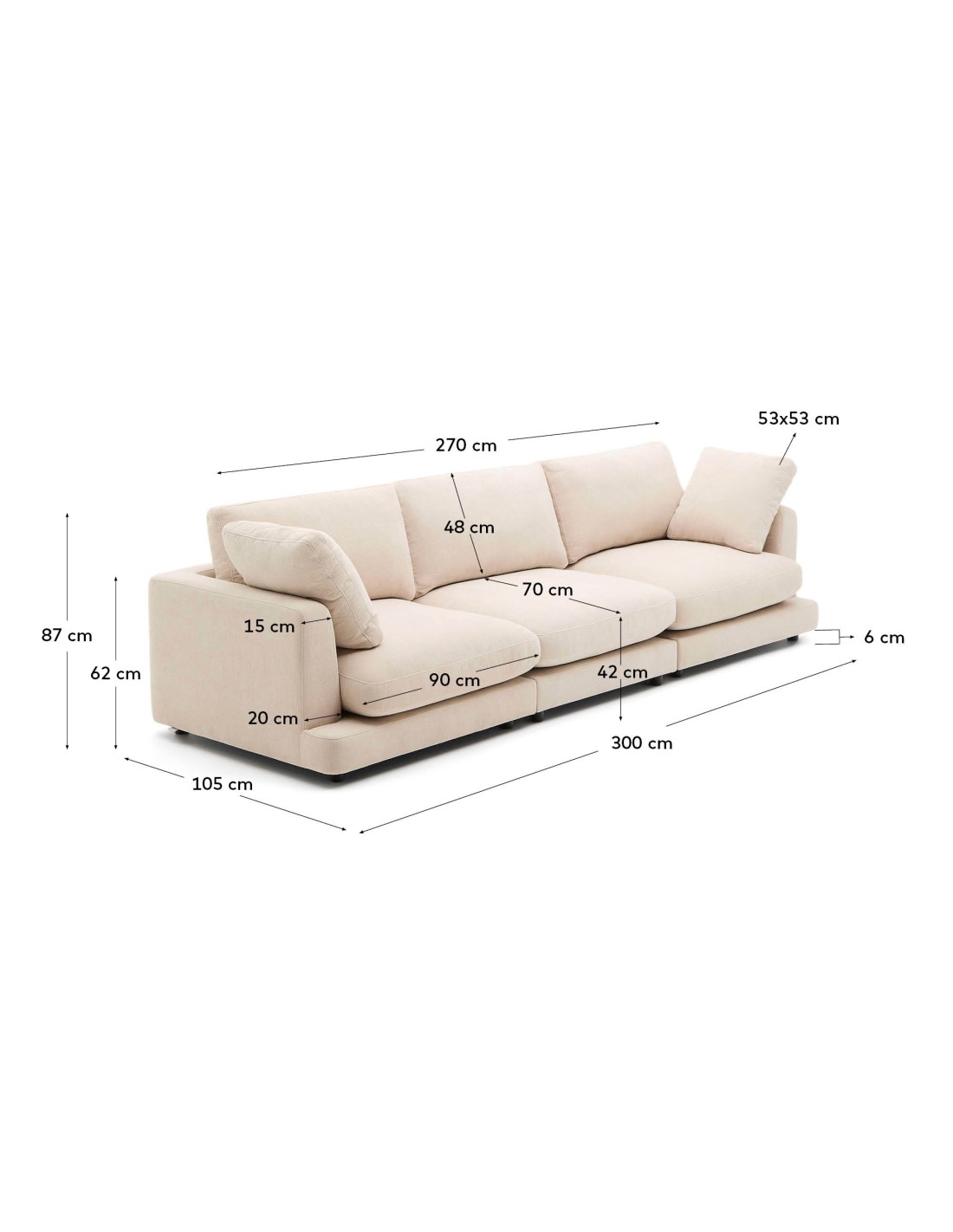Gala combina diseño, confort y calidad en una pieza que transforma tu salón en un espacio relajado y con estilo. Sus formas redondeadas y dimensiones amplias crean un ambiente acogedor, perfecto para disfrutar de momentos especiales en familia o con amigos. Su tapizado en tejido de chenilla de estructura pequeña de alta calidad, hecho de poliéster y algodón, aporta una textura suave y agradable al tacto, además de garantizar una notable resistencia y durabilidad. Incluye un tratamiento antimanchas, lo que permite su limpieza con un paño húmedo con agua. Los asientos y respaldos son desenfundables y pueden lavarse en lavadora. El proveedor del tejido dispone de certificación OEKO-TEX® STANDARD 100 de producción ecológicamente segura y responsable con el medio ambiente. Los cojines del asiento están rellenos de fibras vírgenes de efecto plumón proporcionando una sentada blanda, suave y envolvente. Es un relleno de 100% de fibra soft, una fibra siliconada que ofrece un tacto envolvente y un confort muy similar al plumón, junto con un núcleo de espuma de densidad 30 kg/m³, cubierto por fibra en ambos lados permitiendo voltearlos. Además, incorporan tabiques internos que aseguran una distribución uniforme de las fibras, garantizando un soporte óptimo en cada uso. Los cojines son desenfundables y reversibles. La estructura interna está fabricada con madera de pino certificada FSC Mix Credit, elaborada con una mezcla de materiales procedentes de bosques certificados por FSC y madera controlada FSC. Fabricado en Europa, el sofá Gala refleja la calidad y el cuidado en cada uno de sus detalles. Esta pieza ofrece diseño, confort y durabilidad en una propuesta perfecta para quienes buscan calidad en cada rincón de su hogar. Gala no solo destaca por su estilo elegante y versátil, sino también por su capacidad para adaptarse a las necesidades del día a día, convirtiéndose en el centro de atención de cualquier estancia.