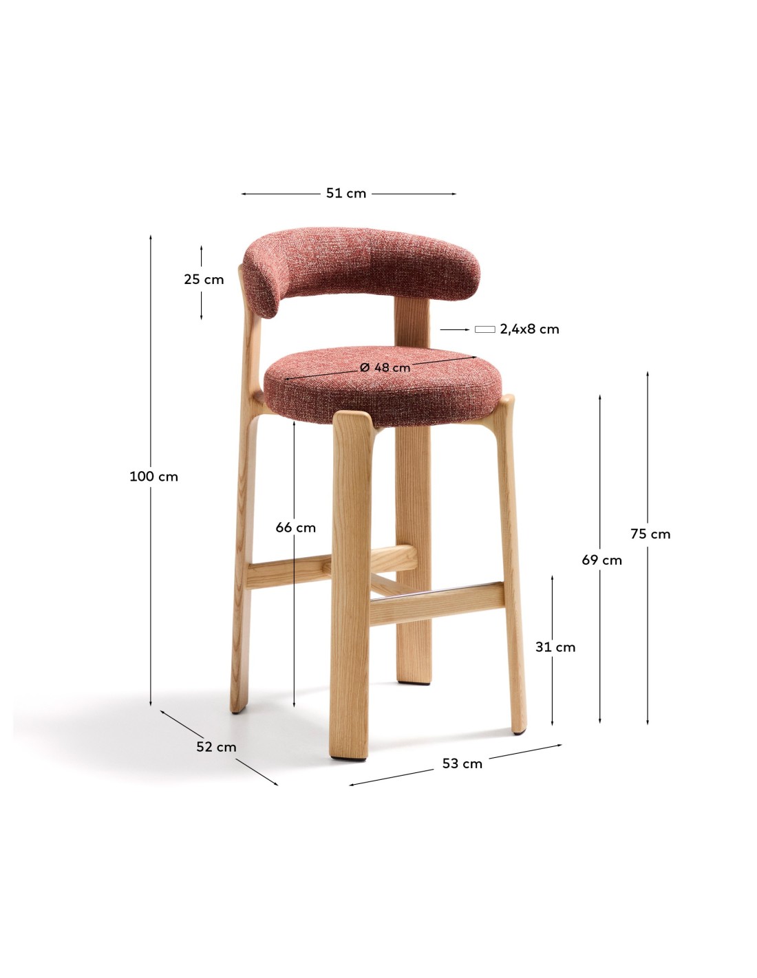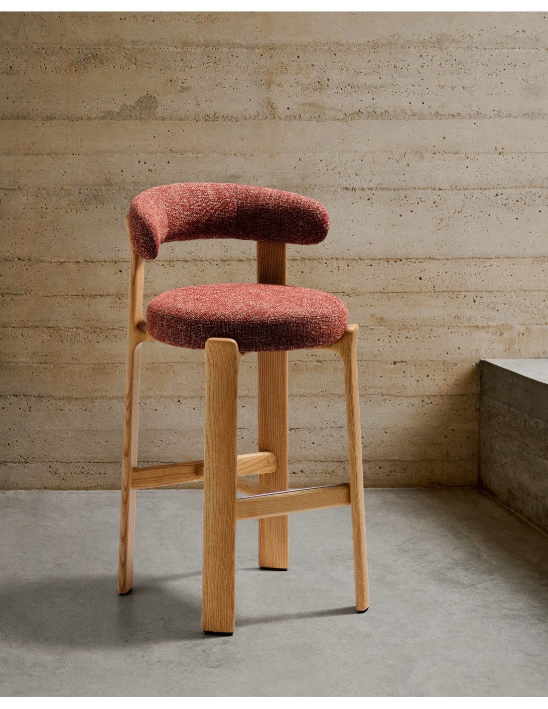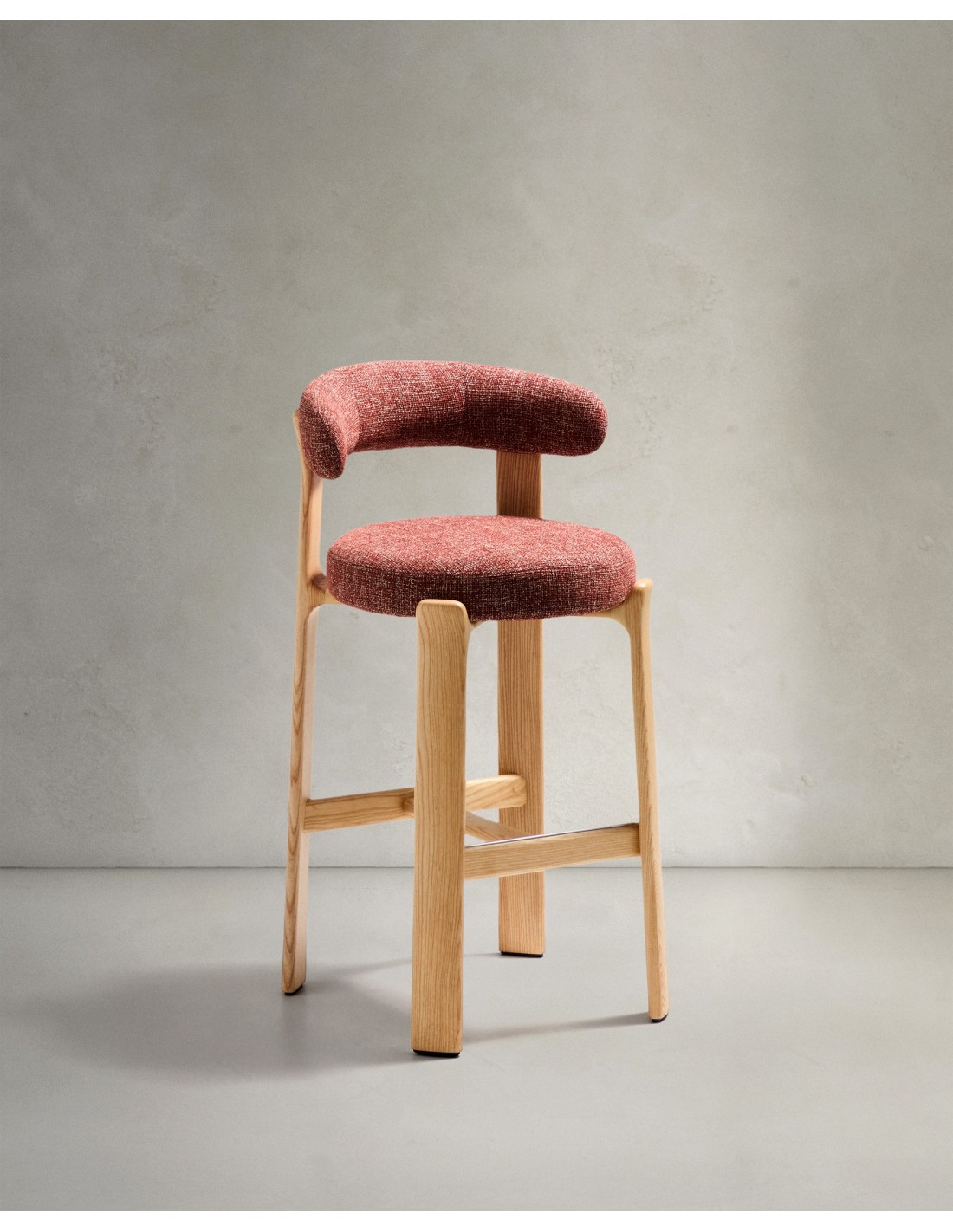 Taburete Granite de chenilla terracota y madera maciza de fresno con acabado tono natural FSC 100% 75 cm - Kave Home