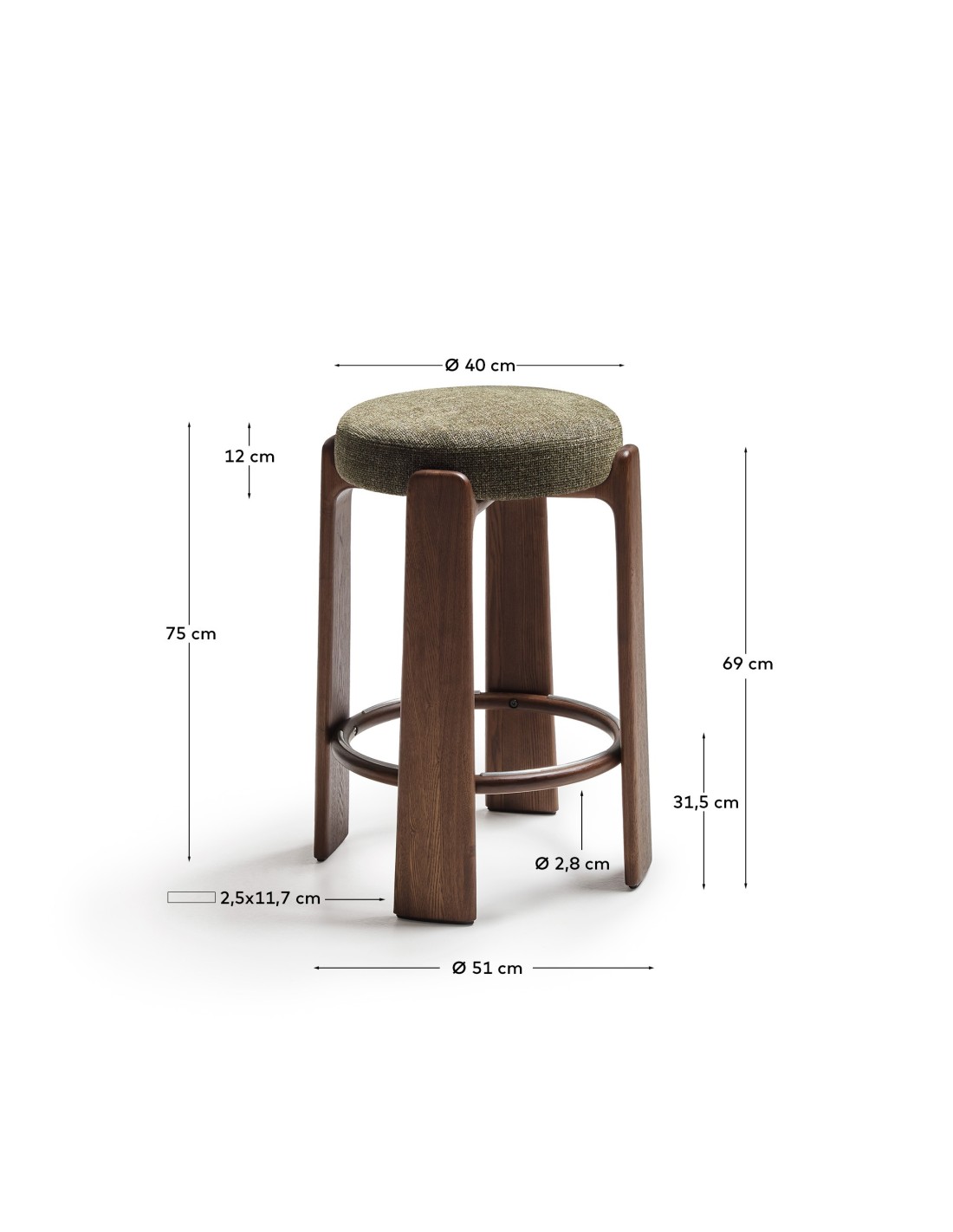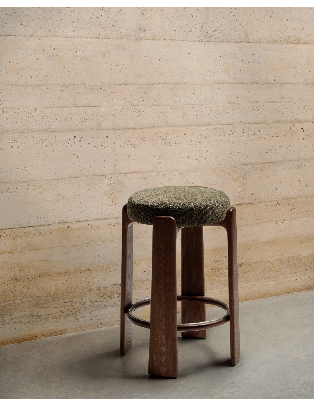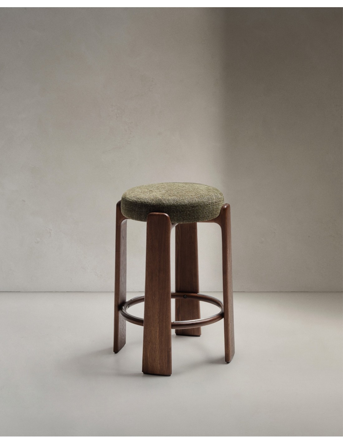 Taburete Granite de chenilla verde y madera maciza de fresno con acabado tono nogal FSC 100% 75 cm - Kave Home