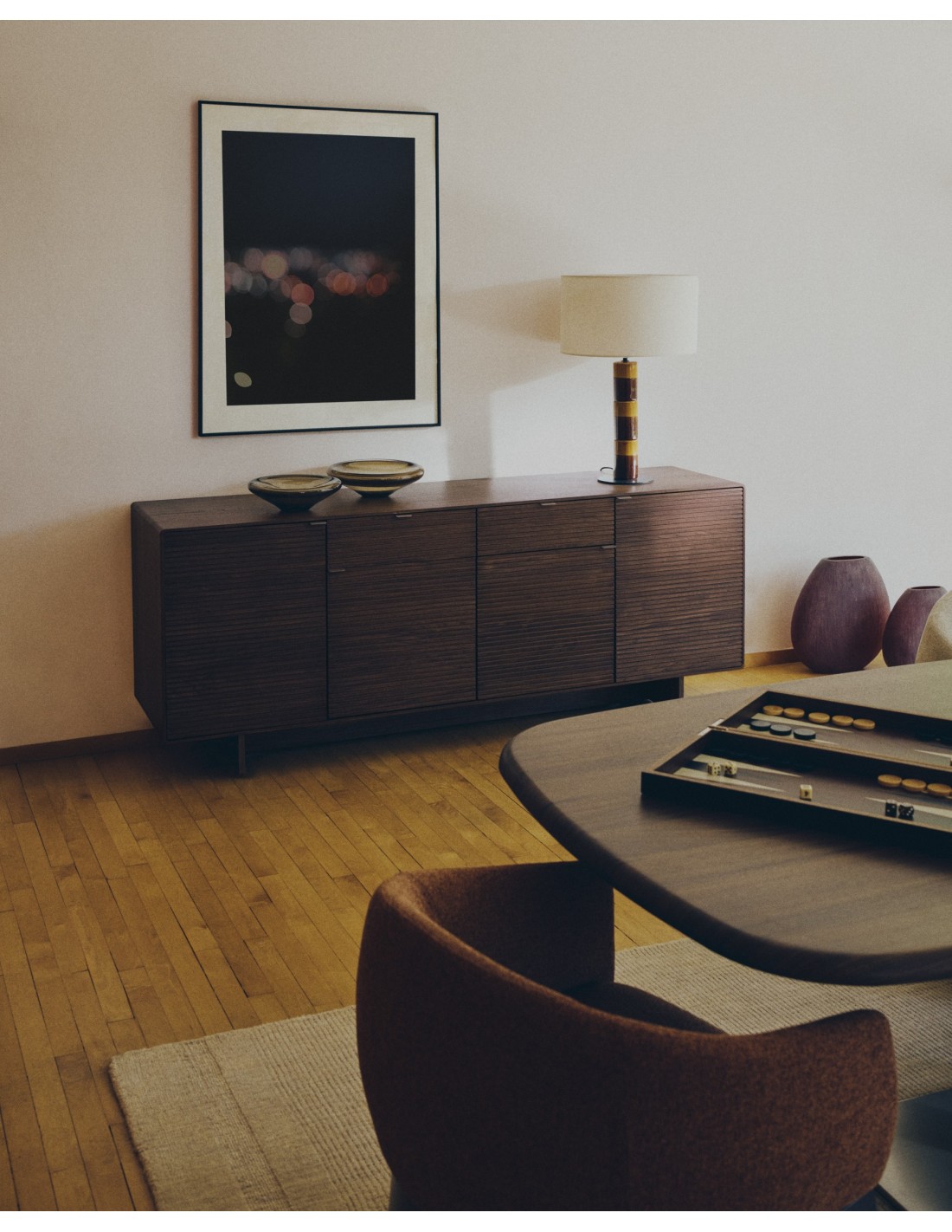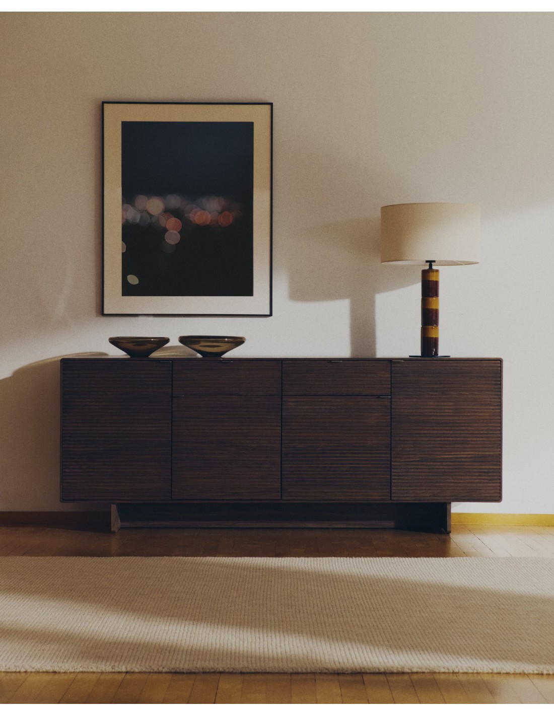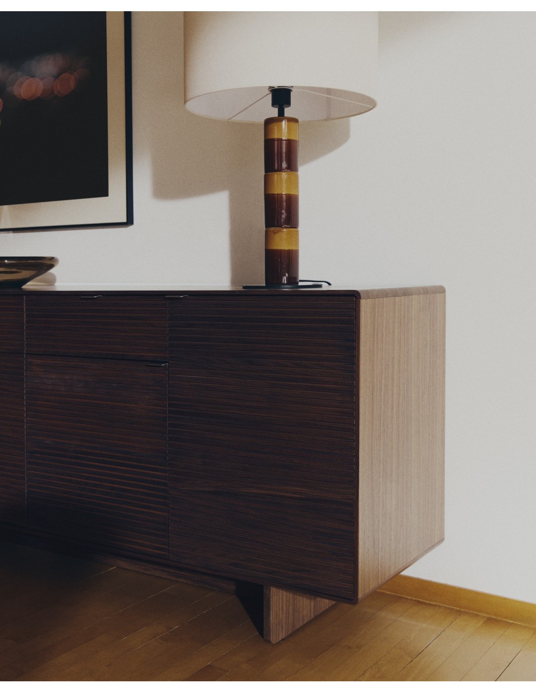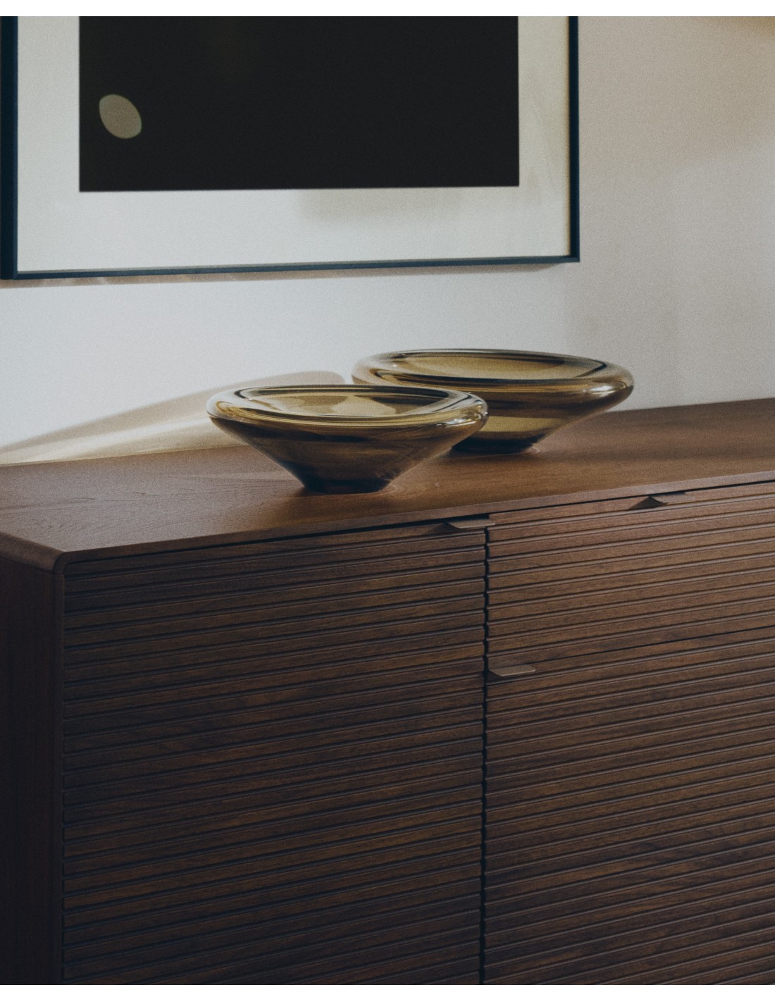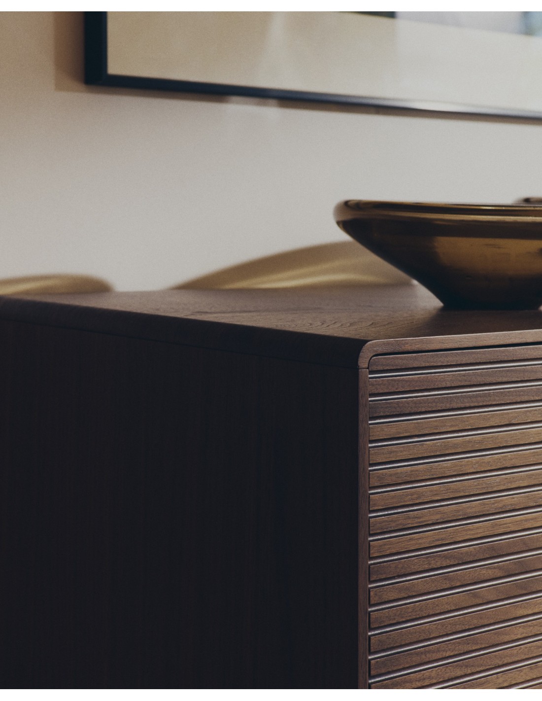 Norlen rinde homenaje al diseño de los años 50 desde una mirada contemporánea, fusionando formas minimalistas con detalles vintage. Las esquinas suavemente redondeadas y la base de madera evocan un aire nostálgico reinterpretado con líneas puras y proporciones actuales. La chapa de nogal oscurecido, aplicada mediante prensa con membrana al vacío, se adapta perfectamente a los radios del mueble, unificando el acabado y aportando profundidad y carácter a cada pieza. Tiene un acabado en barniz de poliuretano, que asegura resistencia al desgaste y a la humedad. La estructura del mueble está hecha de tablero MDF y los paneles interiores están revestidos con melamina con acabado a tono, manteniendo la coherencia del diseño. Los tiradores son de acero inoxidable cepillado con acabado satinado, que reduce la visibilidad de huellas y arañazos y tiene alta resistencia a la corrosión. Además, su diseño inclinado facilita el agarre durante la apertura de la puerta. Además, está certificada con la etiqueta FSC Mix Credit, por lo que está elaborada con una mezcla de materiales procedentes de bosques certificados por FSC y con madera controlada FSC. Cada elemento ha sido pensado para aportar funcionalidad sin renunciar al estilo: desde las baldas interiores y exteriores regulables hasta los herrajes de alta calidad, con bisagras y guías ocultas con acabado anticorrosión. Además, los muebles incorporan reguladores en la base para ajustarse con precisión a cualquier superficie. Una colección que transforma la funcionalidad en una declaración de estilo, hecha para perdurar.
