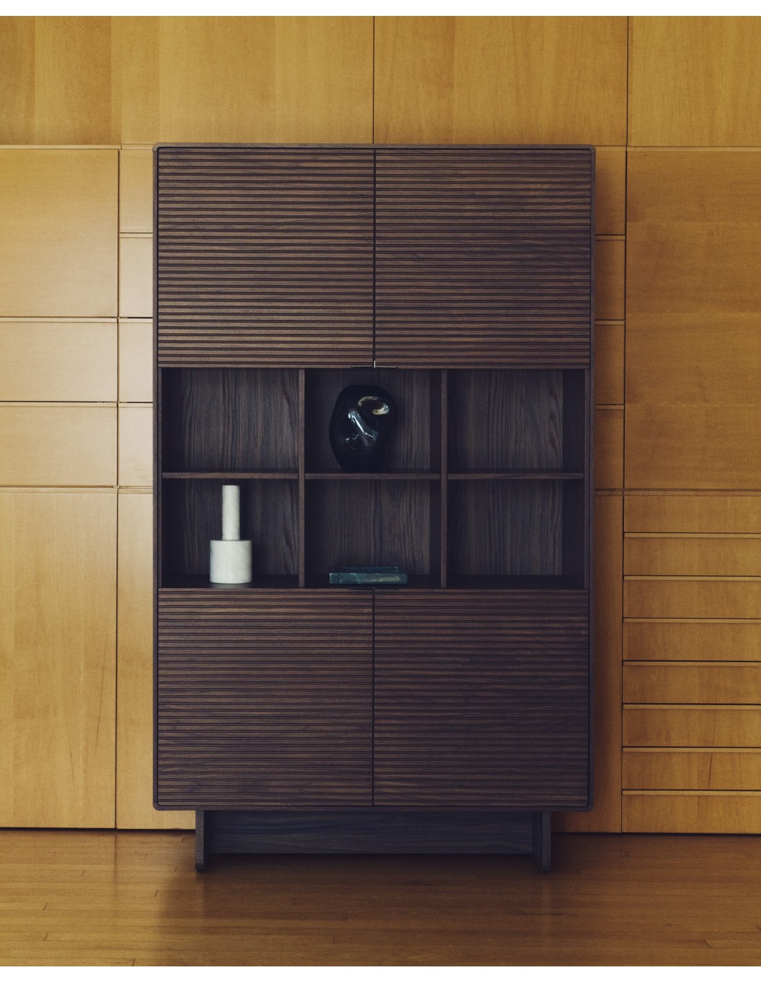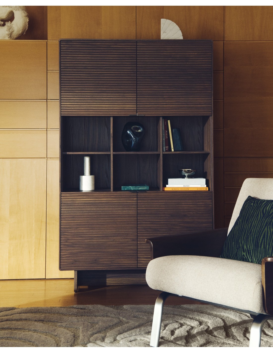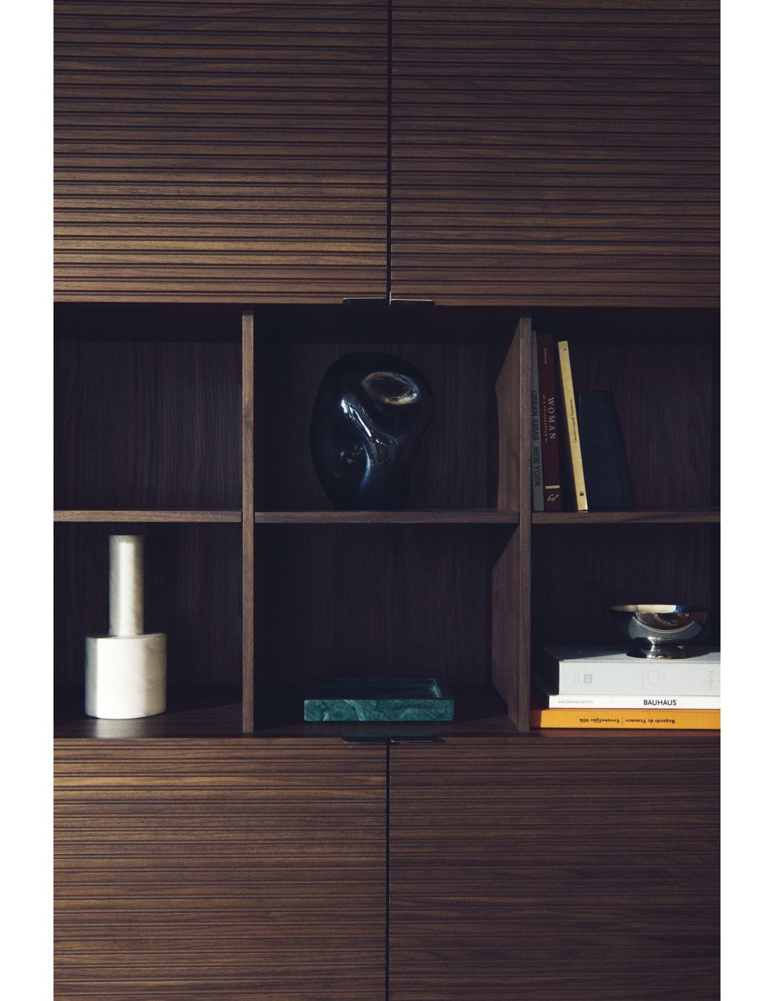 Norlen rinde homenaje al diseño de los años 50 desde una mirada contemporánea, fusionando formas minimalistas con detalles vintage. Las esquinas suavemente redondeadas y la base de madera evocan un aire nostálgico reinterpretado con líneas puras y proporciones actuales. La chapa de nogal oscurecido, aplicada mediante prensa con membrana al vacío, se adapta perfectamente a los radios del mueble, unificando el acabado y aportando profundidad y carácter a cada pieza. Tiene un acabado en barniz de poliuretano, que asegura resistencia al desgaste y a la humedad. La estructura del mueble está hecha de tablero MDF y los paneles interiores están revestidos con melamina con acabado a tono, manteniendo la coherencia del diseño. Los tiradores son de acero inoxidable cepillado con acabado satinado, que reduce la visibilidad de huellas y arañazos y tiene alta resistencia a la corrosión. Además, su diseño inclinado facilita el agarre durante la apertura de la puerta. Está certificada con la etiqueta FSC Mix Credit, por lo que está elaborada con una mezcla de materiales procedentes de bosques certificados por FSC y con madera controlada FSC. Cada elemento ha sido pensado para aportar funcionalidad sin renunciar al estilo: desde las baldas interiores y exteriores regulables hasta los herrajes de alta calidad, con bisagras y guías ocultas con acabado anticorrosión. Además, los muebles incorporan reguladores en la base para ajustarse con precisión a cualquier superficie. Una colección que transforma la funcionalidad en una declaración de estilo, hecha para perdurar.