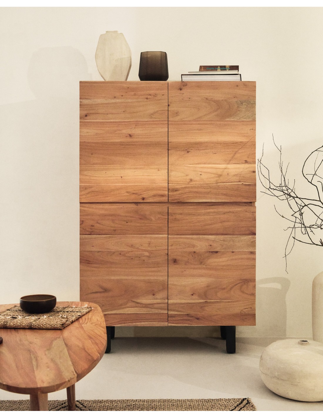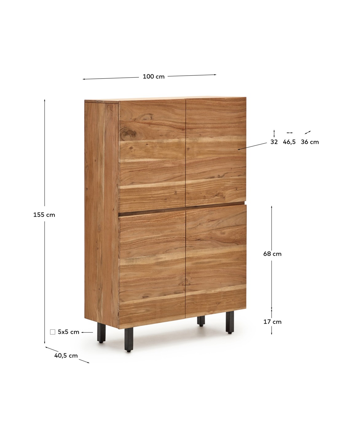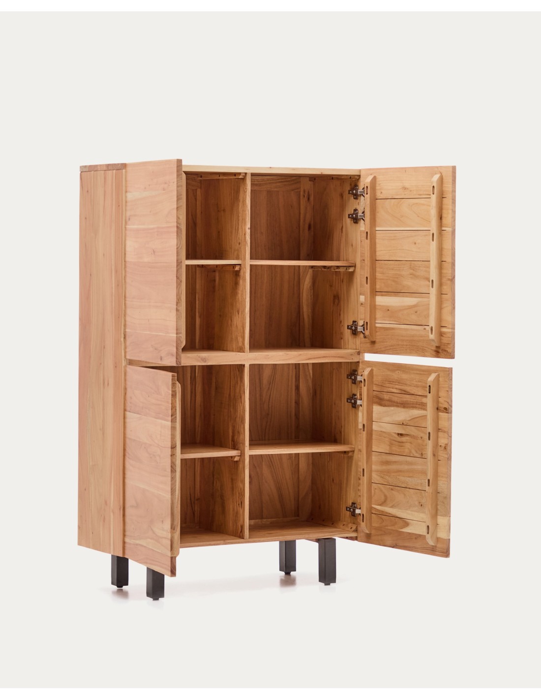 Aparador alto Uxue 4 puertas de madera maciza de acacia con acabado blanqueado y acero negro 100 x 155 cm - Kave Home