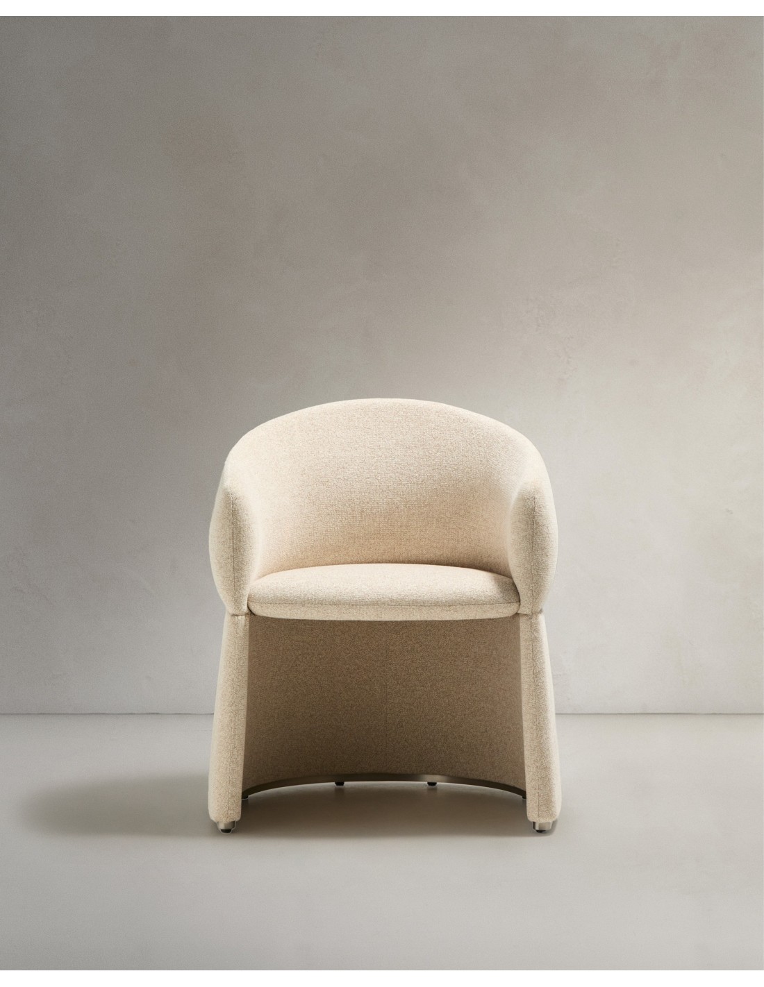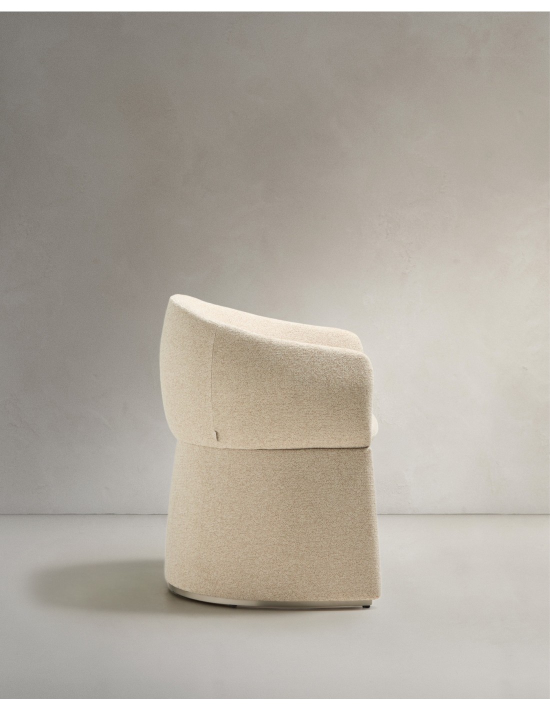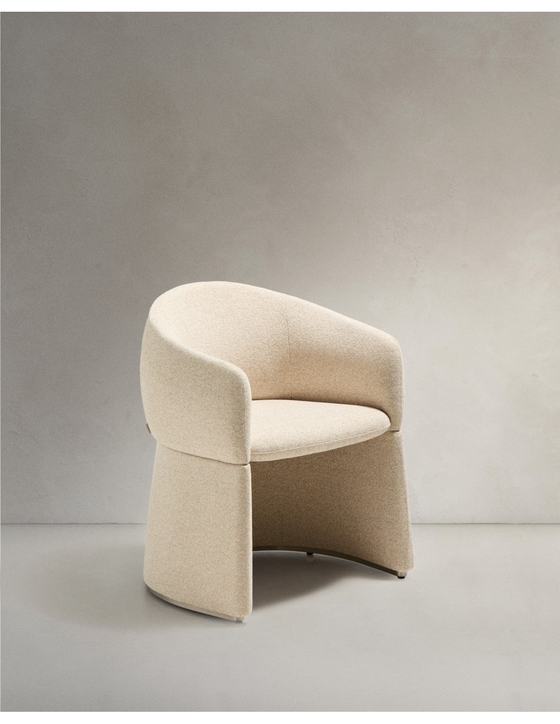 Esta silla destaca por su diseño escultural, donde las formas generosas y envolventes se equilibran con una silueta sutil y refinada. El asiento, amplio y acogedor, se apoya sobre una base de tablero contrachapado tapizado con un marco permietral metálico para proteger el tejido. El tapizado es de chenilla con estructura pequeña: suave al tacto, resistente al uso diario y compuesto al 100 % por poliéster reciclado, procedente de un proveedor certificado por Global Recycled Standard. Este tejido incorpora tratamiento repelente al agua y está avalado por la certificación OEKO-TEX® STANDARD 100, que garantiza una producción segura y respetuosa con el medio ambiente. Ofrece una sentada de firmeza media gracias a la combinación de cinchas y muelles con espuma de inyección de 55 kg/m³, que mantiene la firmeza y la forma con el paso del tiempo. Incorpora protectores de fieltro en las patas para evitar marcas y rayaduras en el suelo y un marco perimetral metálico en la base para proteger el tejido. Una pieza pensada para durar, funcional tanto en espacios domésticos como comerciales.