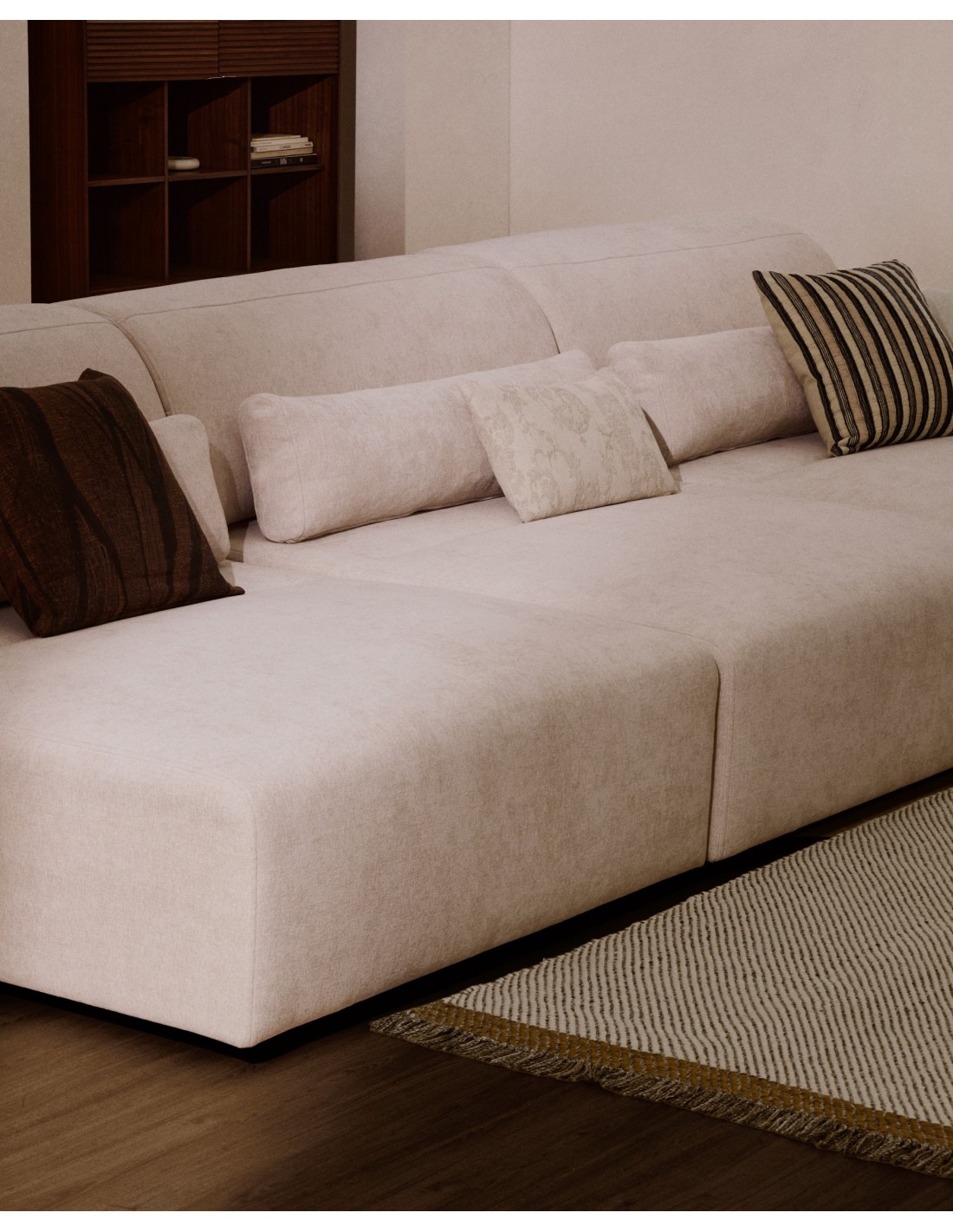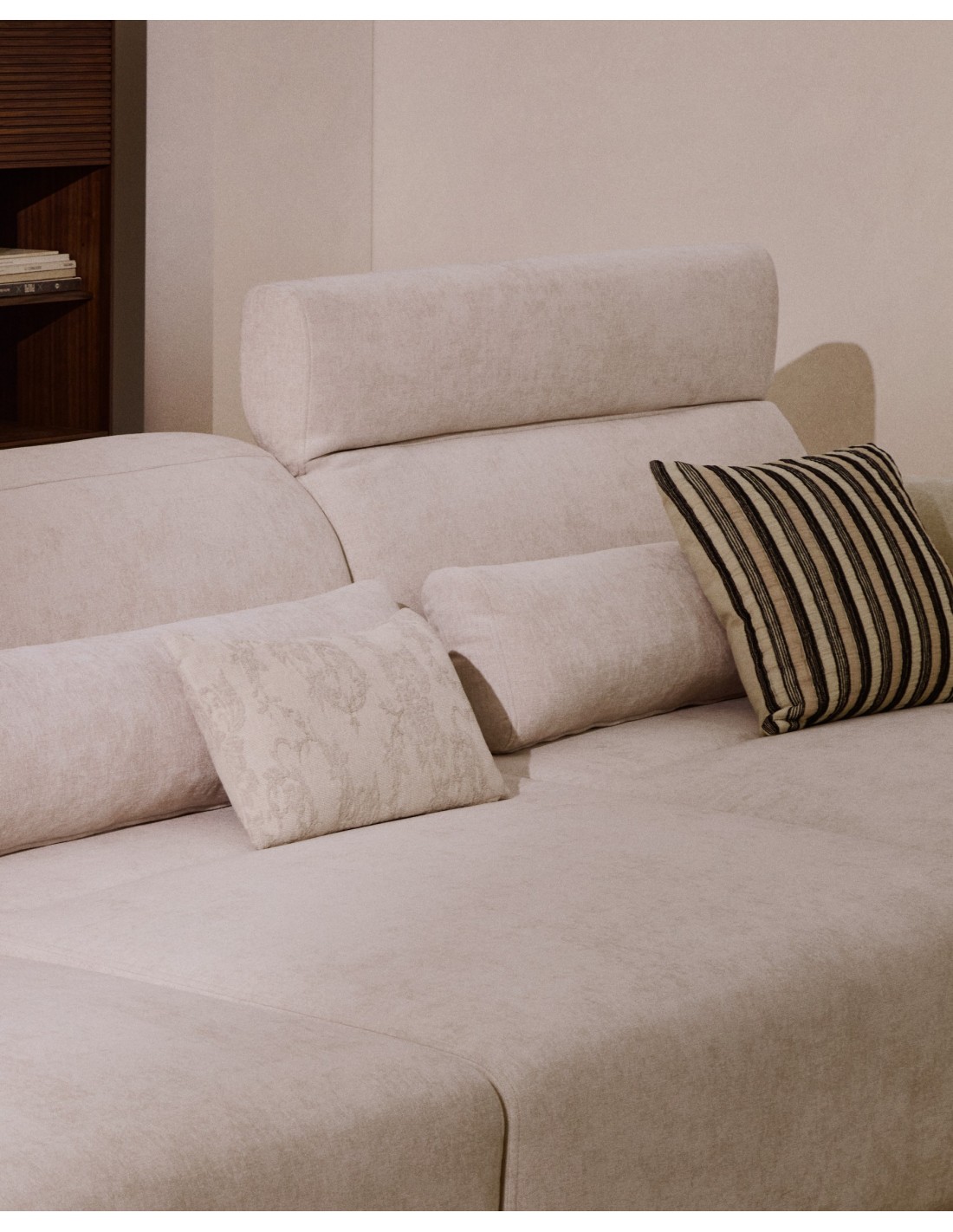 Sofá Lares 6 plazas con asientos deslizantes motorizados y cabezal reclinable de chenilla beige 410 cm - Kave Home