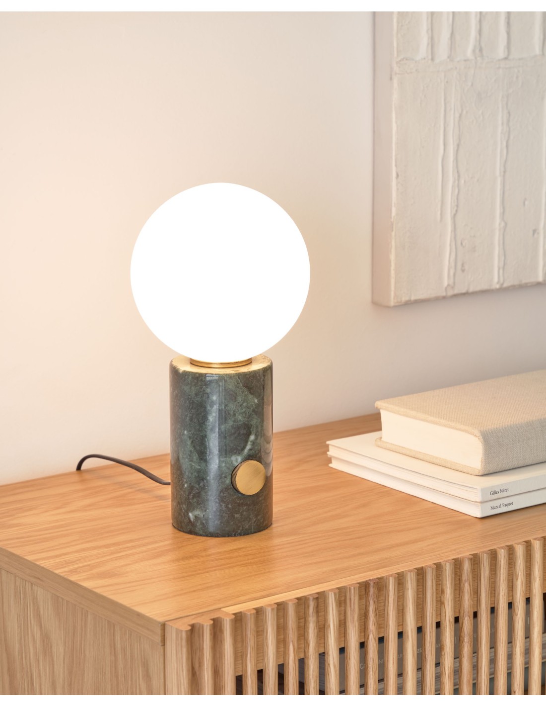La colección de lámparas Lonela destaca por su pantalla esférica de cristal glaseado unida a una base de mármol con acabado verde. Un diseño que brilla por si solo.