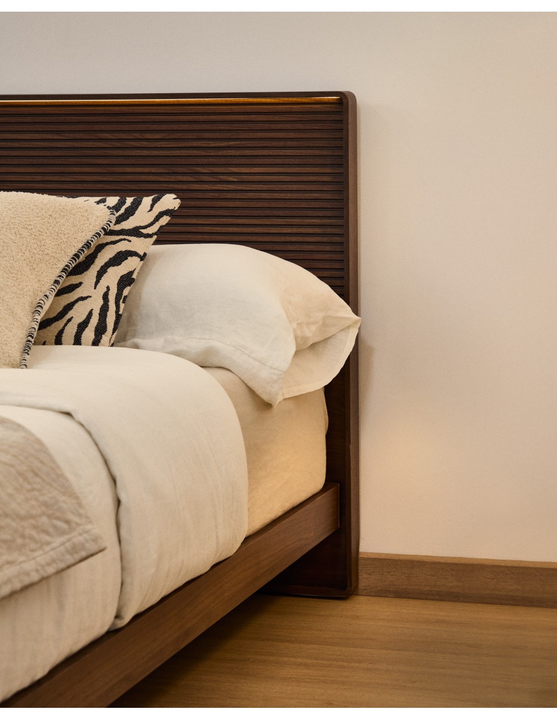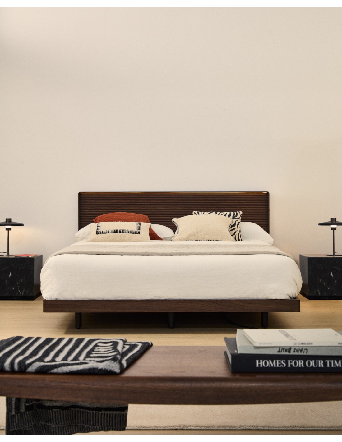 Norlen rinde homenaje al diseño de los años 50 desde una mirada contemporánea, fusionando formas minimalistas con detalles vintage. Las esquinas suavemente redondeadas y la base de madera evocan un aire nostálgico reinterpretado con líneas puras y proporciones actuales. El cabecero, hecho en chapa de nogal con un delicado fresado lineal horizontal, aporta carácter y profundidad visual, mientras que su tira de luz LED integrada en la parte superior baña la estancia con una iluminación de 3000K, una luz cálida y agradable de sutil tono amarillento, perfecta para crear un ambiente envolvente y acogedor en los momentos de descanso. La luz del cabecero se activa con un mando a distancia. El cable de 1,5 metros con enchufe directo a la corriente facilita una instalación cómoda y versátil en cualquier espacio. La base de la cama, sólida y robusta, integra un somier con 14 lamas de madera contrachapada de abedul, diseñado para ofrecerte el soporte perfecto y una óptima ventilación de tu colchón. Las 9 patas de madera maciza de abedul, con una elegante sección redonda y perfil exterior recubierto de chapa de nogal, aseguran máxima estabilidad y continuidad estética en el diseño, fusionando belleza y funcionalidad en cada detalle. Madera certificada FSC Mix Credit, elaborada con una mezcla de materiales procedentes de bosques certificados por FSC y madera controlada FSC. Esta cama es la opción ideal para quienes buscan un equilibrio perfecto entre diseño sofisticado, innovación técnica y máxima comodidad en el dormitorio.