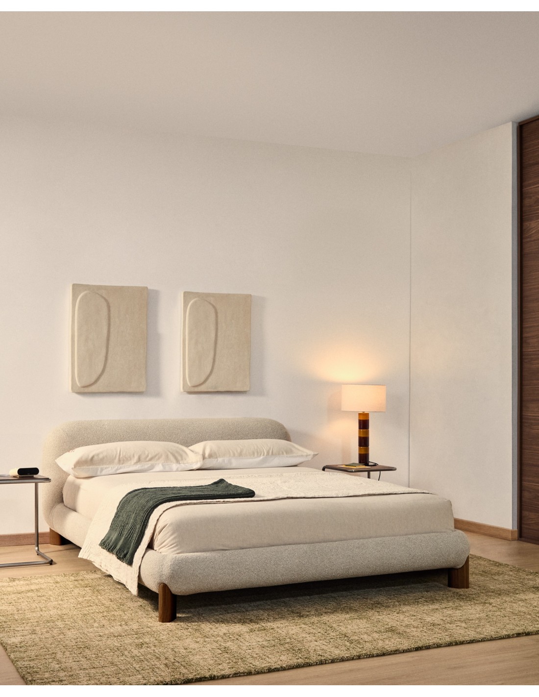 Esta cama desenfundable en tejido bouclé redefine la elegancia contemporánea con un diseño de formas redondeadas que se extienden tanto en la estructura como en el cabecero y las patas, creando una silueta suave y acogedora que invita al descanso. Sus patas de madera maciza de fresno, cuidadosamente diseñadas para sobresalir por encima de la funda, aportan un toque sofisticado y original, logrando el efecto visual de una cama tapizada a pesar de ser completamente desenfundable. En su interior, la estructura combina madera y espuma de distintas densidades para garantizar resistencia, confort y ese aspecto envolvente tan característico. La funda, confeccionada en poliéster 100%, es totalmente desenfundable y lavable a máquina en agua fría, lo que facilita el mantenimiento. El diseño elevado de las patas no solo aporta ligereza visual, sino que permite el paso de robots aspiradora, facilitando tu rutina diaria. El tejido cuenta con certificación OEKO-TEX® STANDARD 100 de producción ecológicamente segura y responsable con el medio ambiente.