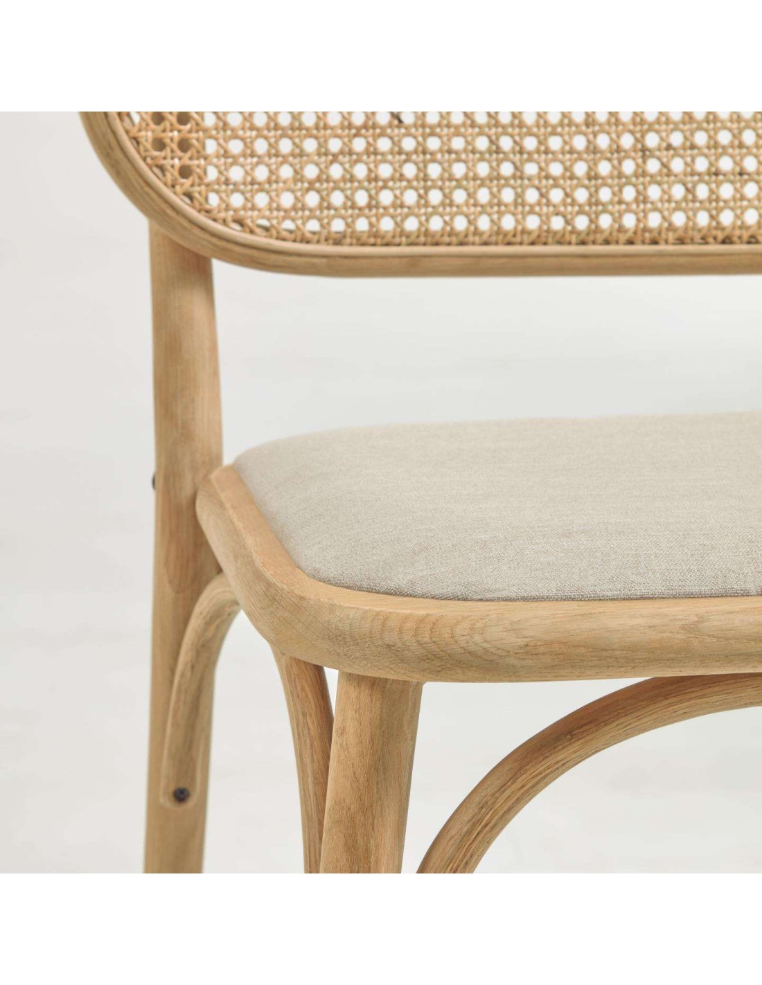 La silla Doriane es una pieza artesanal hecha con madera maciza de roble sostenible, ratán trenzado a mano y un asiento con un tapizado efecto lino hidrorepelente.. Ideal para conseguir un comedor de tendencia con look natural gracias a su diseño clásico totalmente renovado.