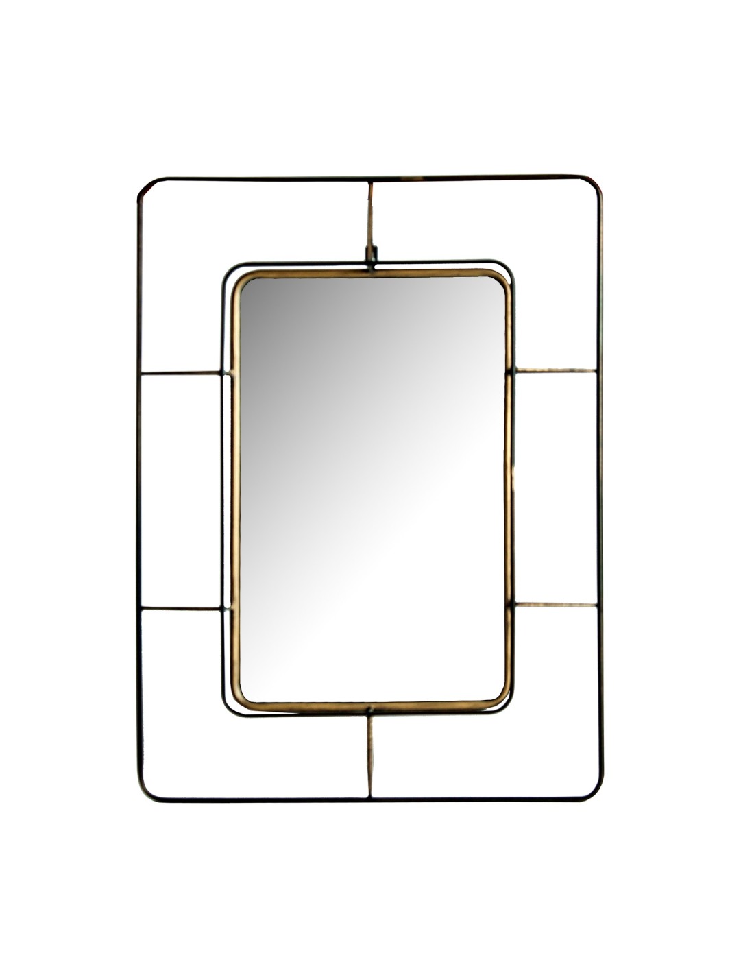 Espejo rectangular Veresa de estilo Art Deco, fabricado en hierro en color oro con acabado viejo, combinado con espejo en color negro.