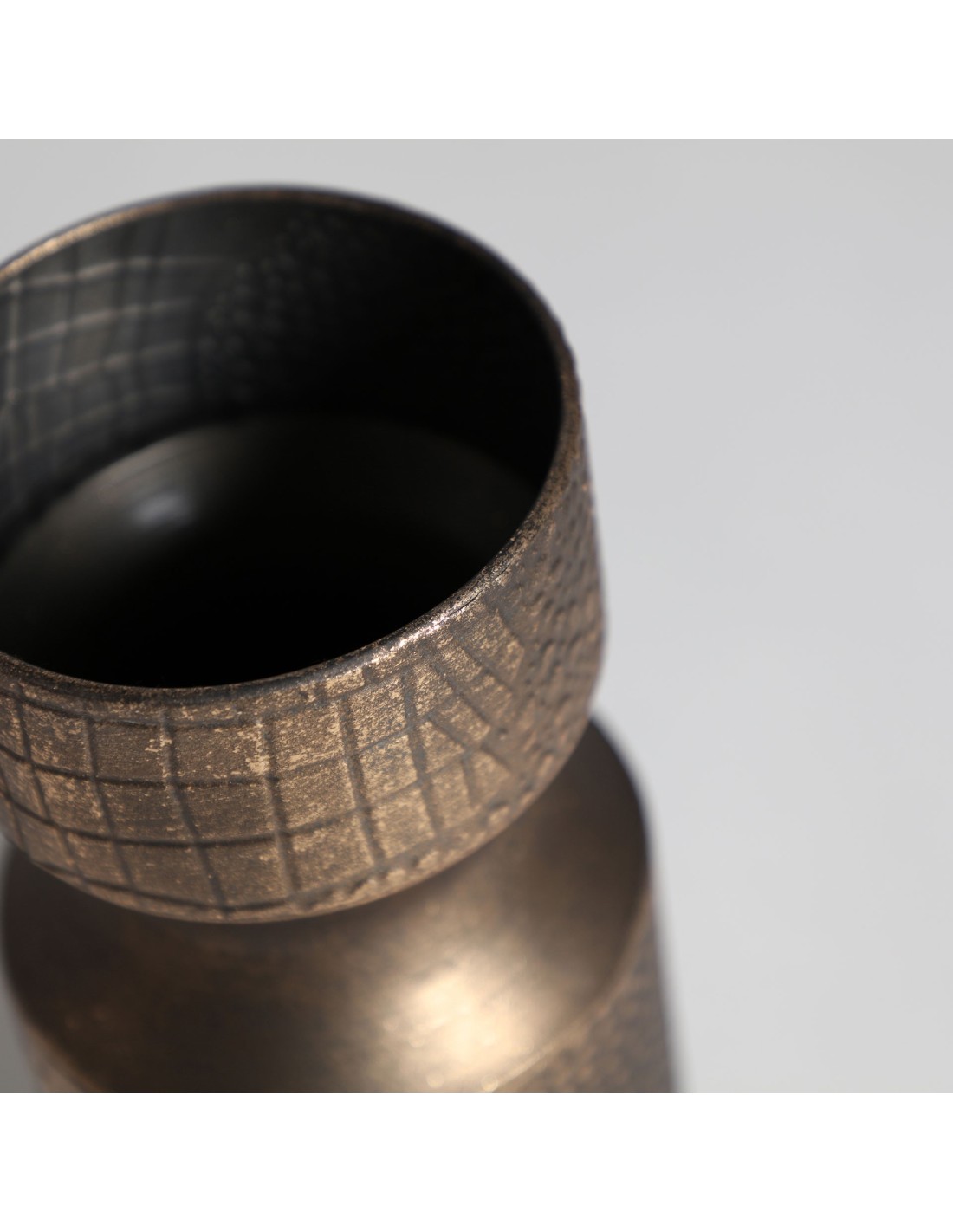 Jarrón redondo Vesc de estilo Art Deco, fabricado en acero en color oro con acabado antic.