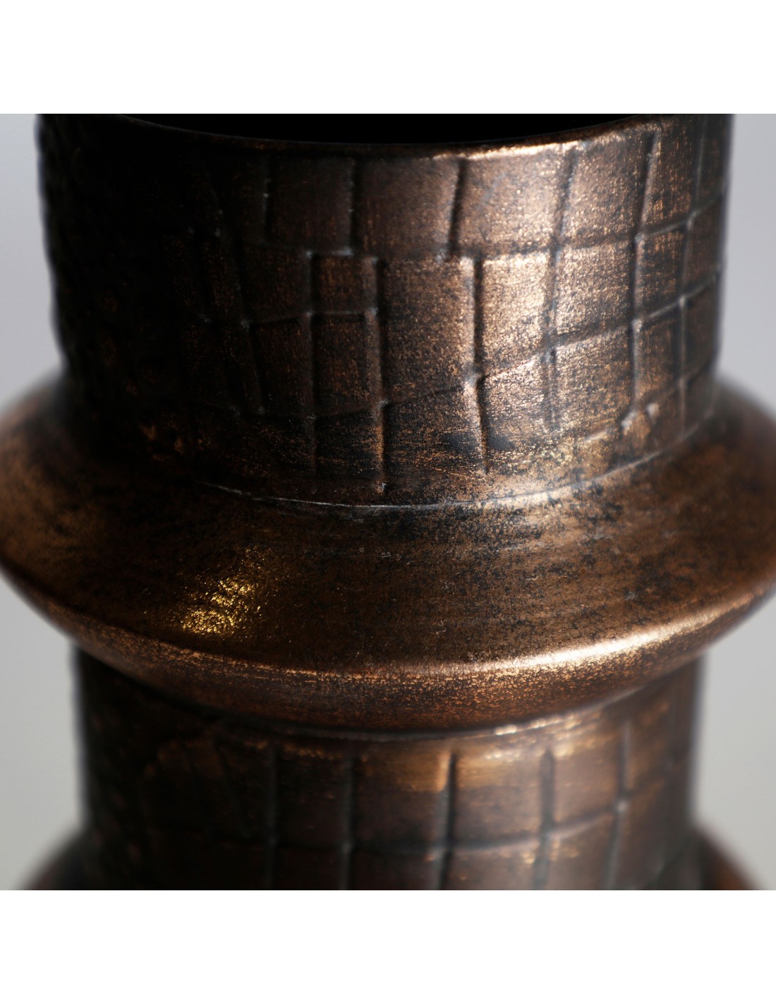 Jarrón redondo Vesc de estilo Art Deco, fabricado en acero en color oro con acabado antic.