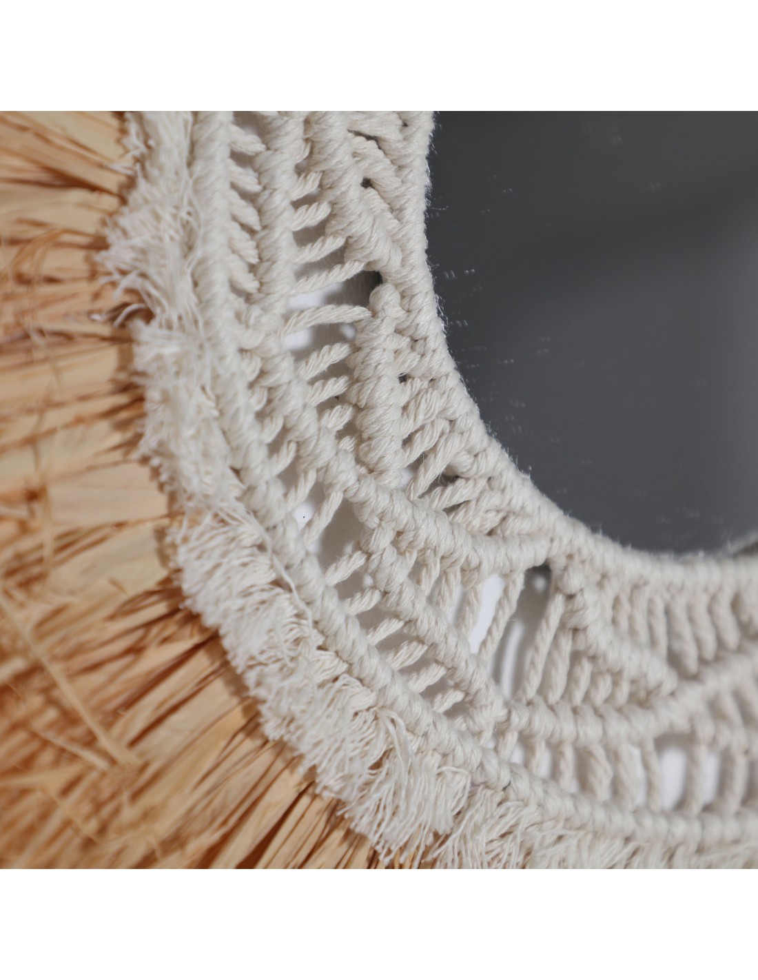 Espejo redondo Kasses de estilo Boho, fabricado en rafia en color marrón, combinado con plástico y cuerda. Espejo plástico.