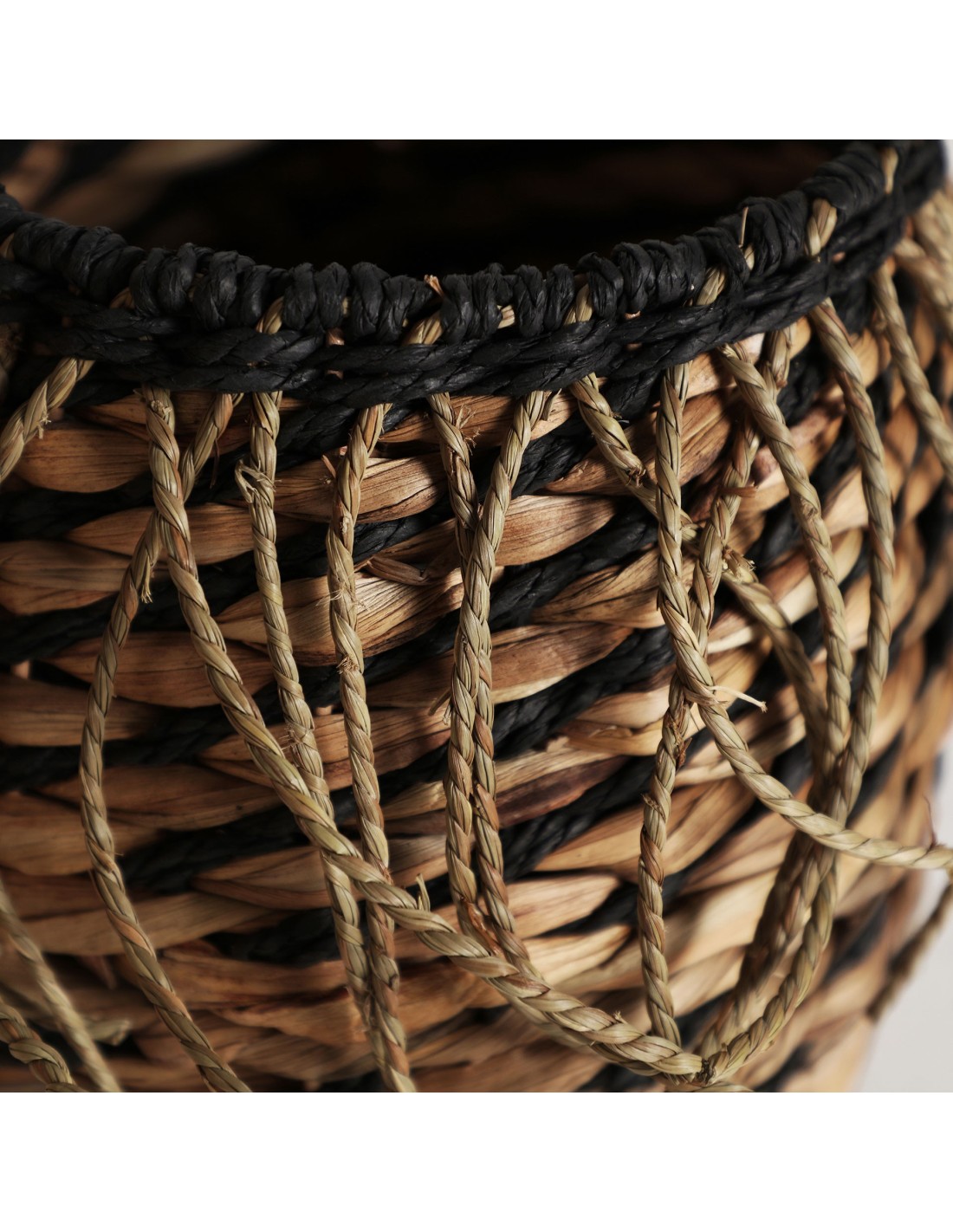 Set de 2 cestos Blair de estilo Boho, fabricados en fibra natural en color negro, combinado con hierro en color natural y cuerda.