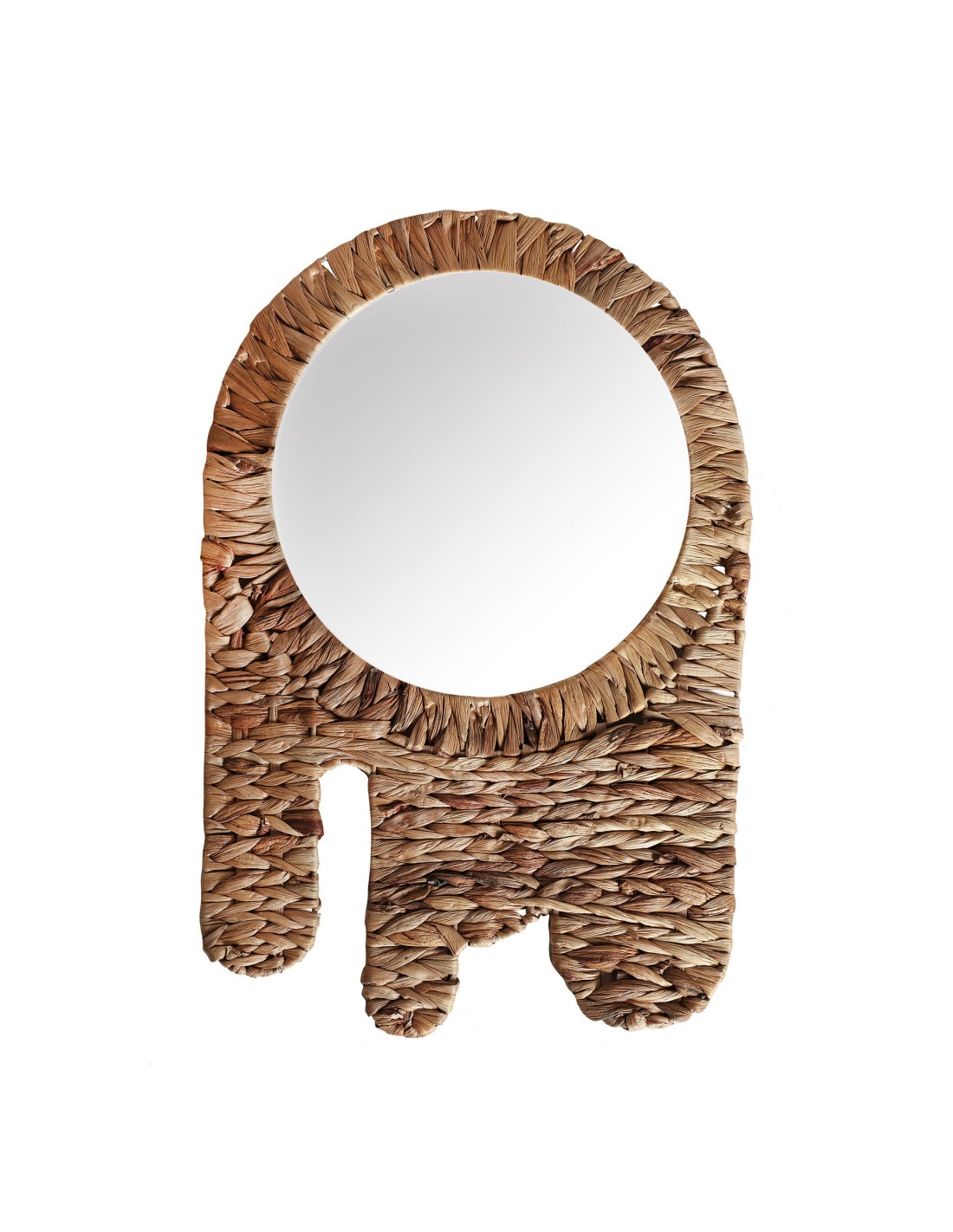 Espejo irregular Blair de estilo Boho, fabricado en paja en color marrón, combinado con espejo y hierro.