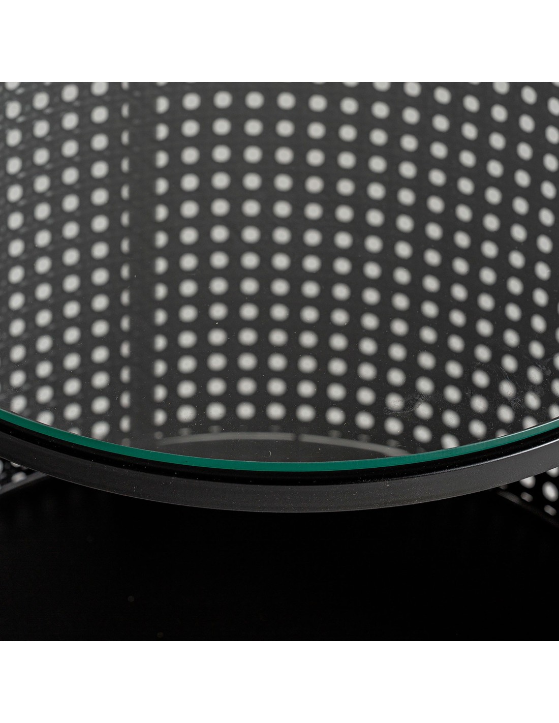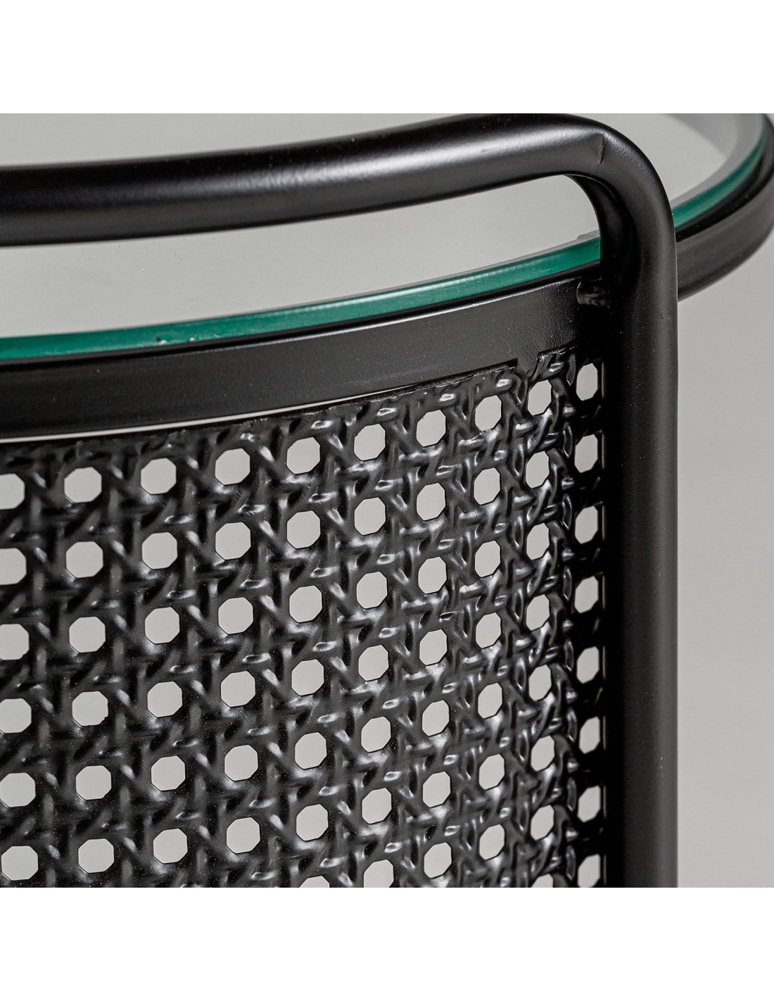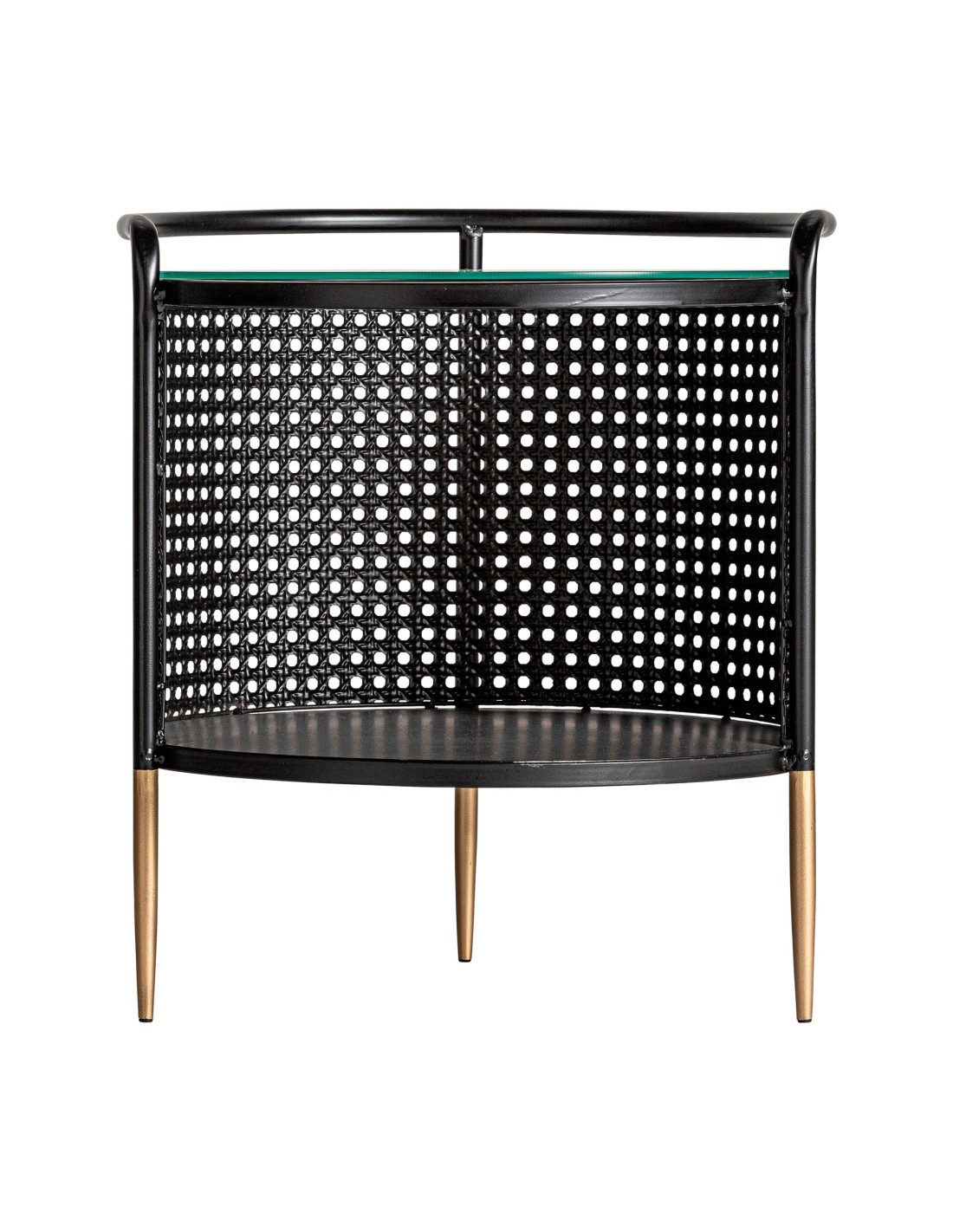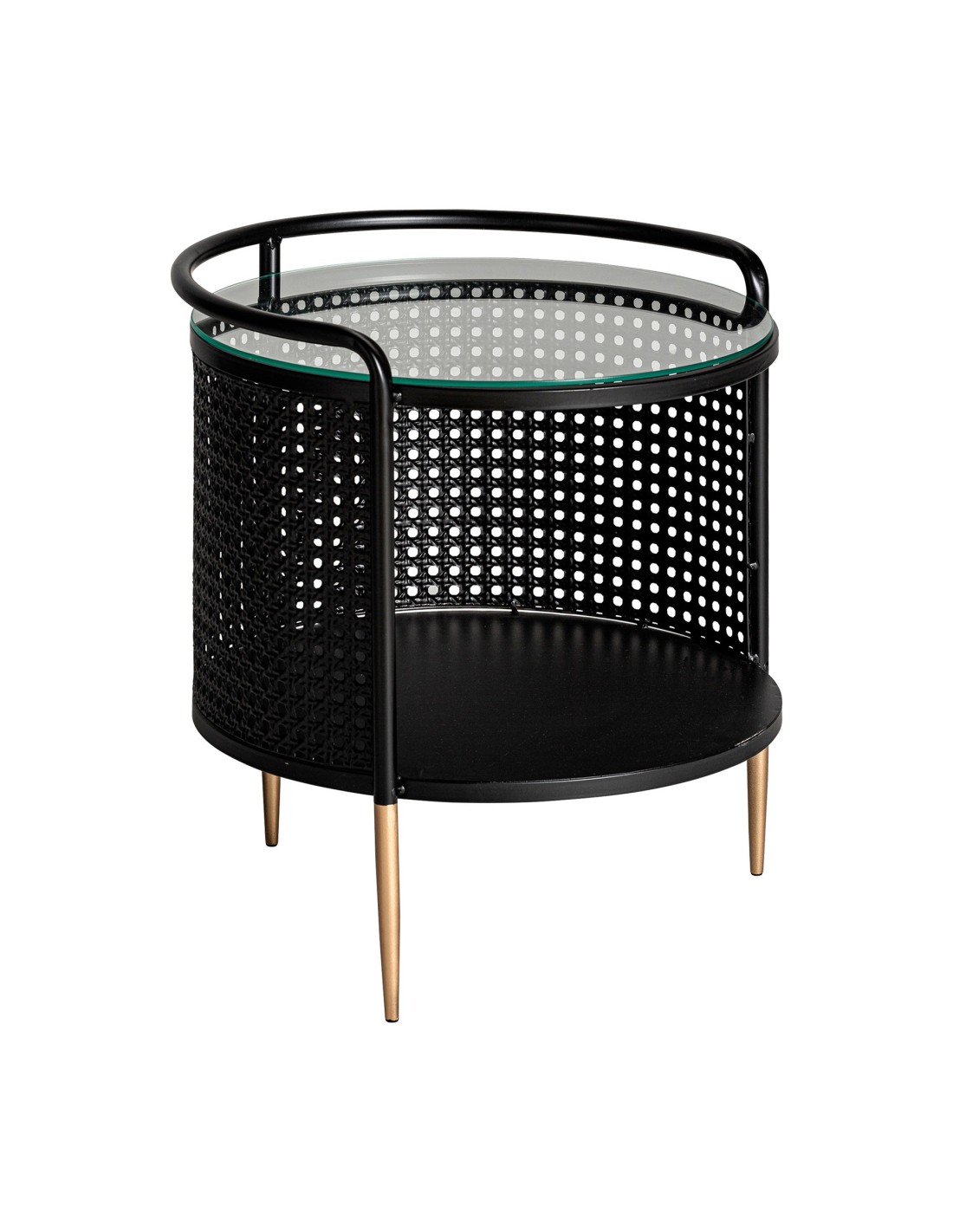 Mesa auxiliar redonda Fussen de estilo Art Deco, fabricada en hierro en colores negro y oro, con vidrio acabado transparente. Producto desmontable.