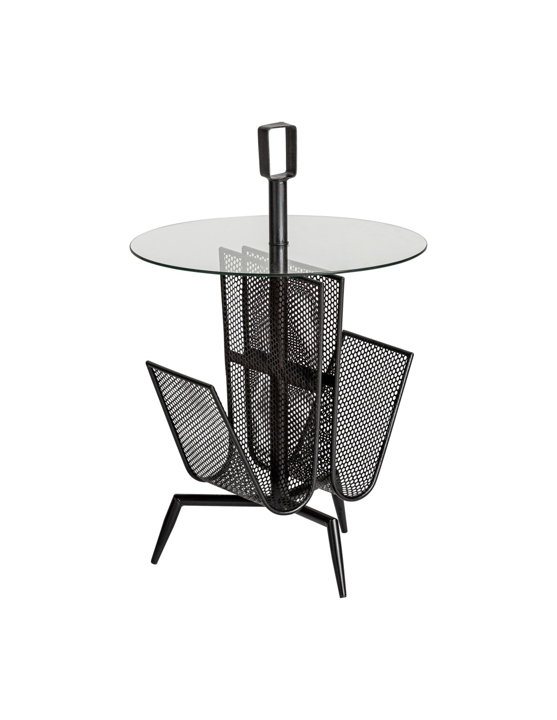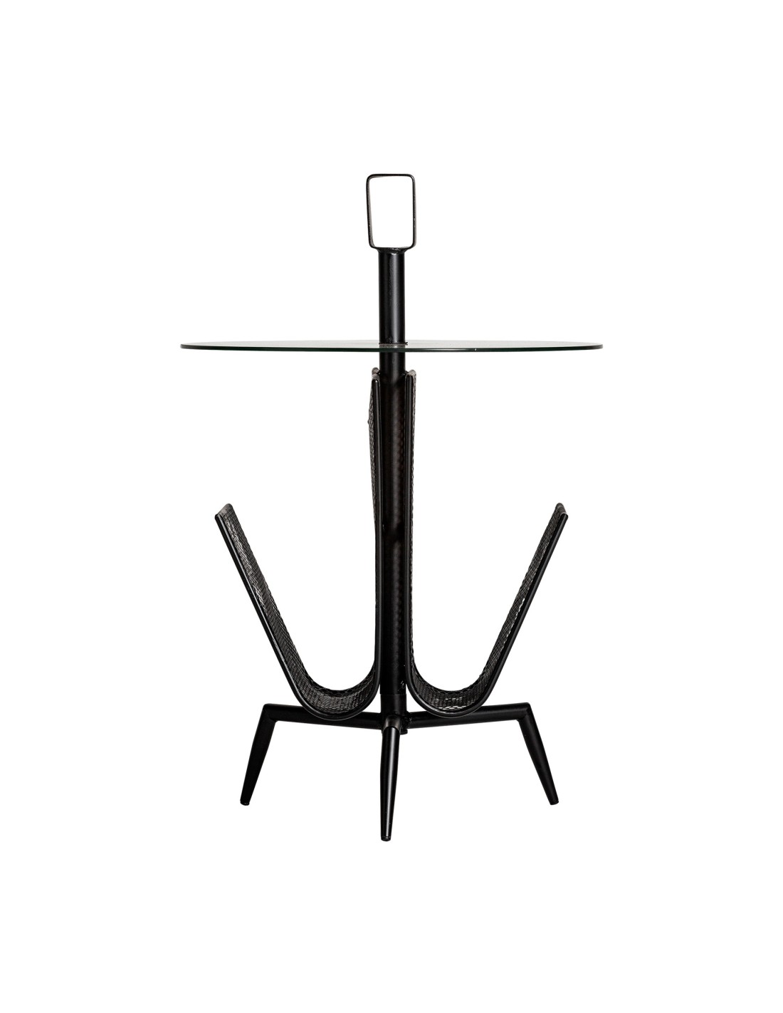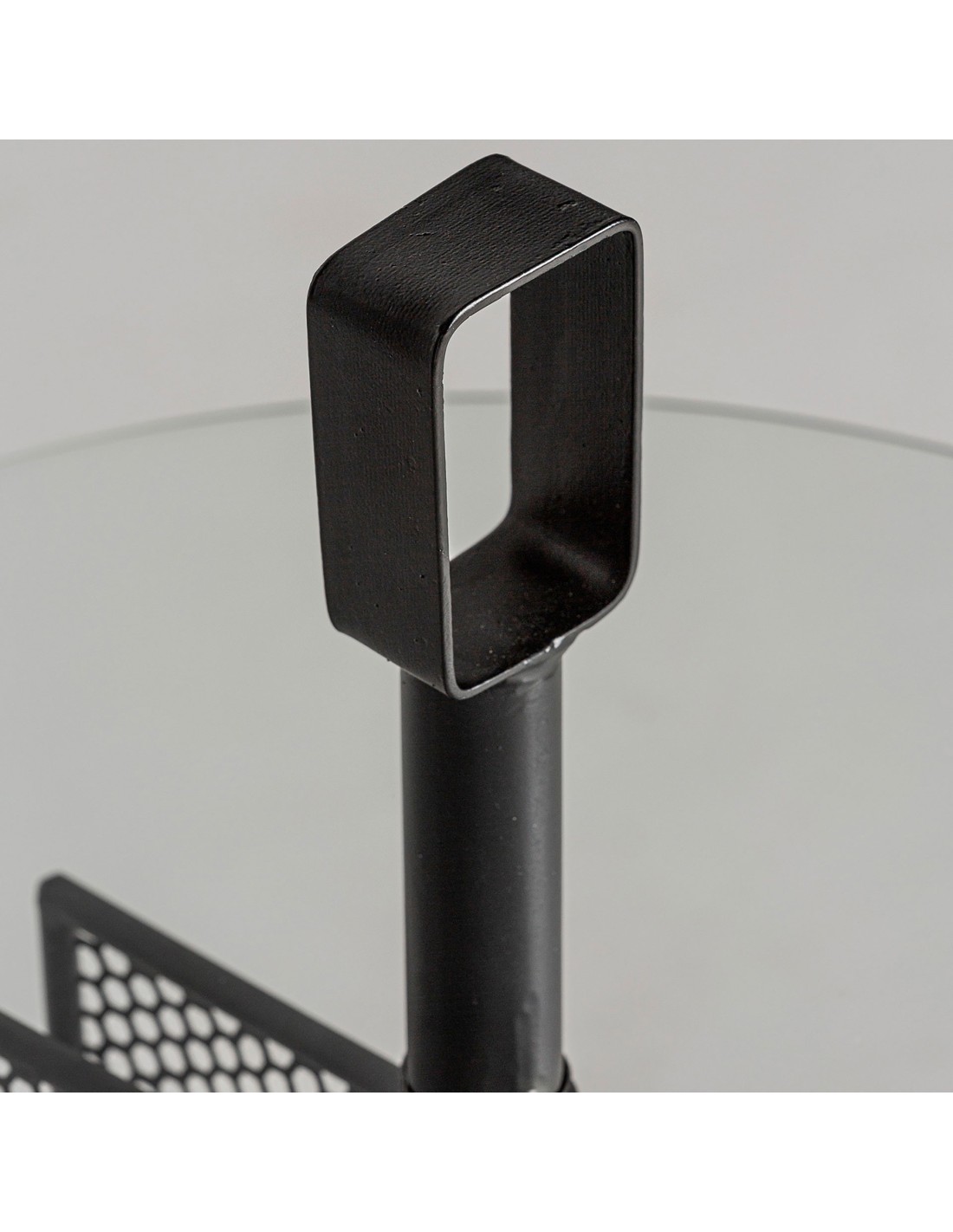 Mesa auxiliar redonda Fussen de estilo Art Deco, fabricada en hierro color negro, en combinación con vidrio acabado transparente. Producto desmontable.