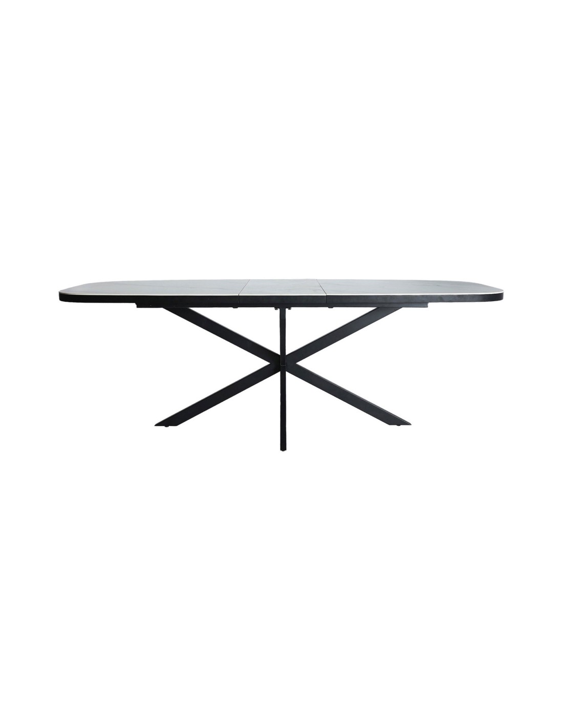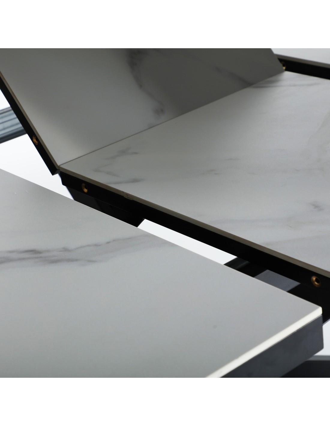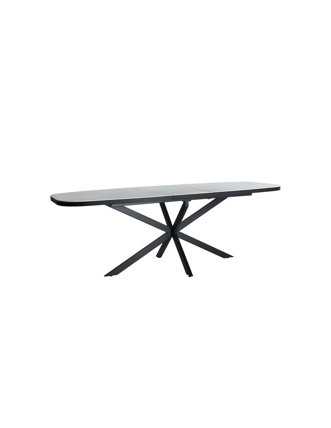 Mesa extensible Droux de estilo Contemporáneo, fabricada en DM acabado blanco, en combinación con cerámica a tono y hierro en color negro. Producto desmontable.