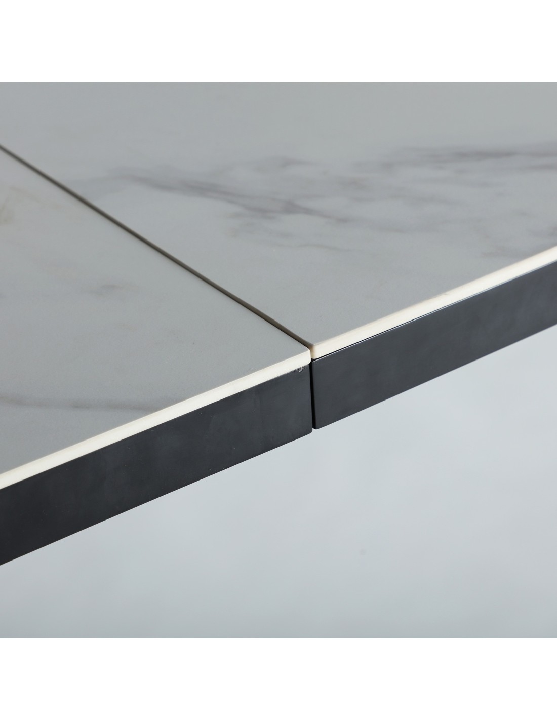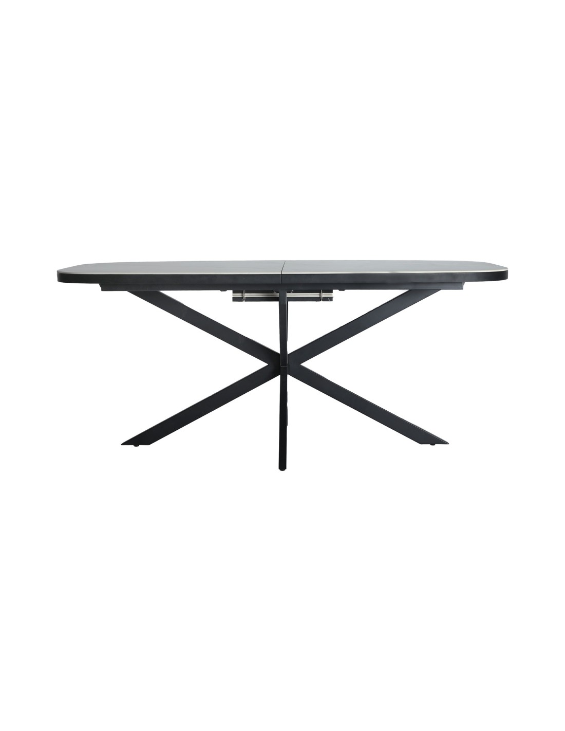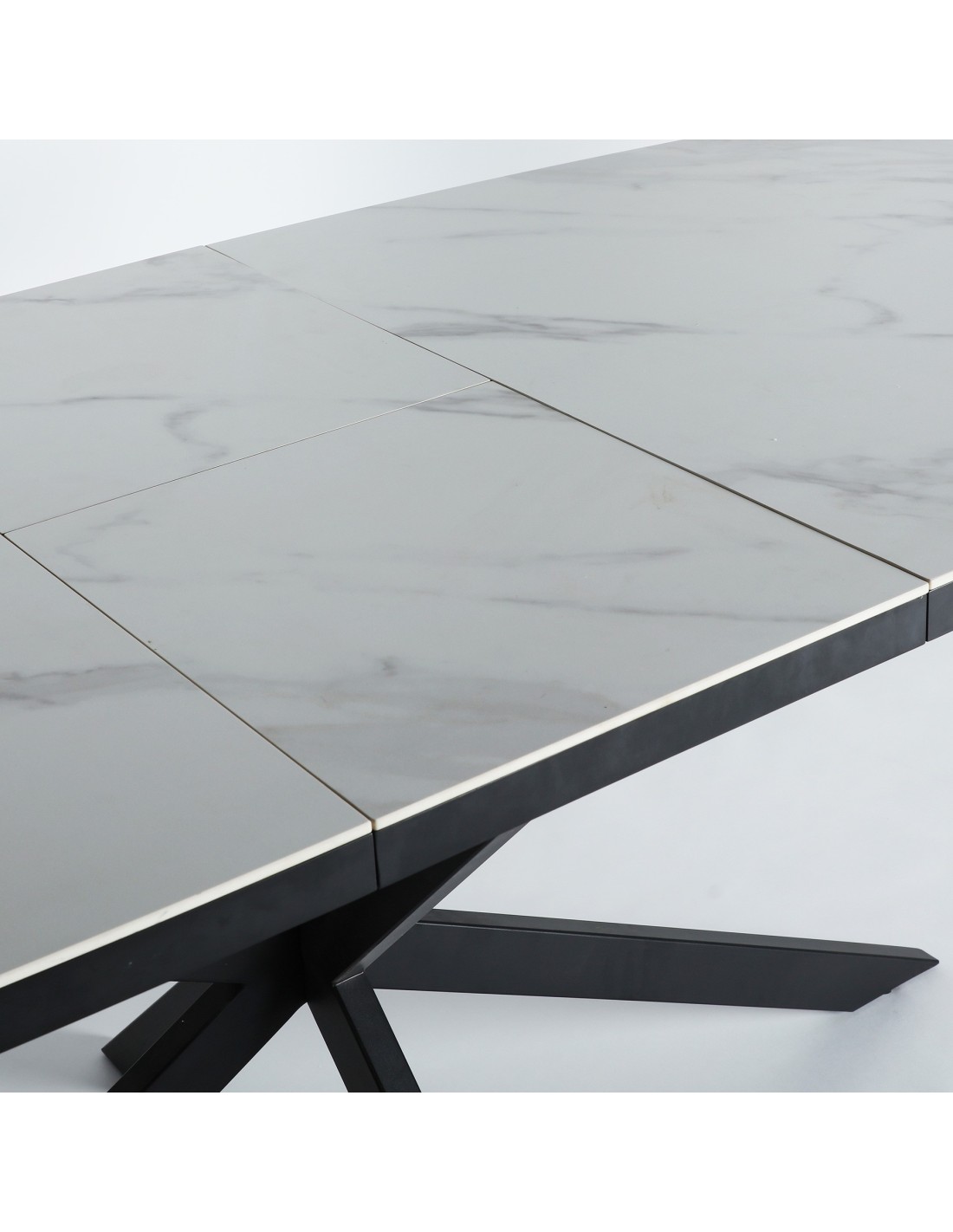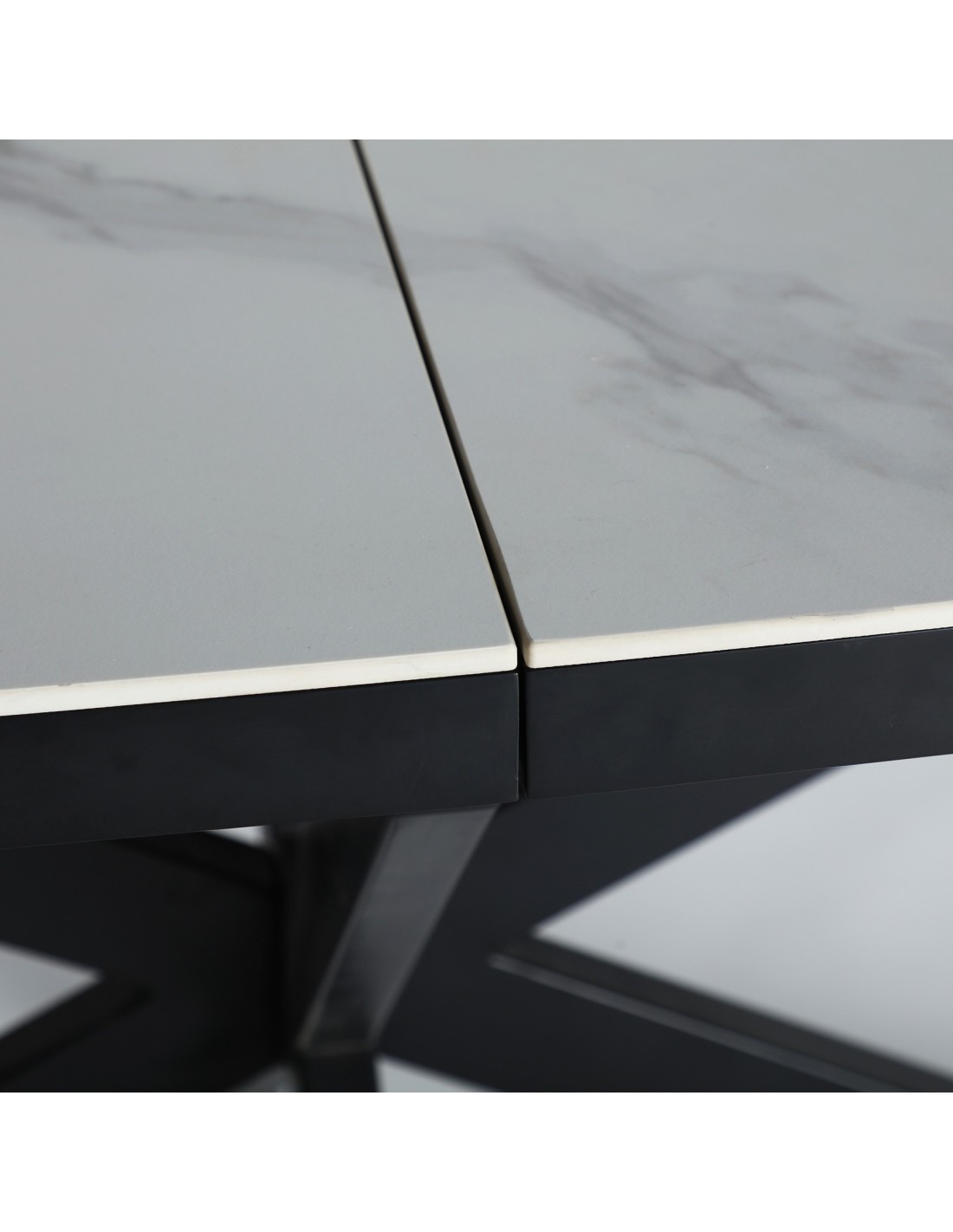 Mesa extensible Droux de estilo Contemporáneo, fabricada en DM acabado blanco, en combinación con cerámica a tono y hierro en color negro. Producto desmontable.