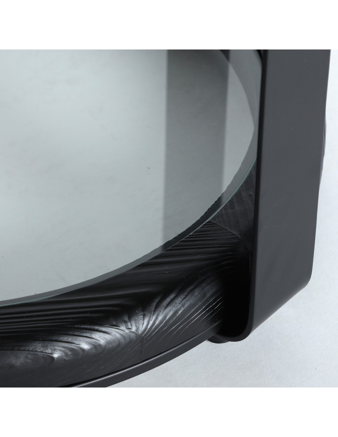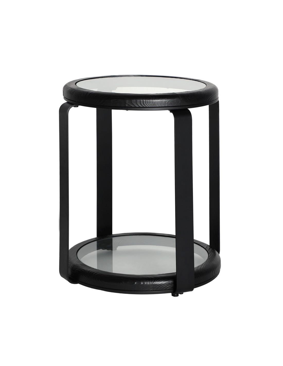 Mesa auxiliar Kilde de estilo Minimalista, fabricada en madera de abeto acabado negro, en combinación con cristal transparente acabado templado y hierro en color negro.