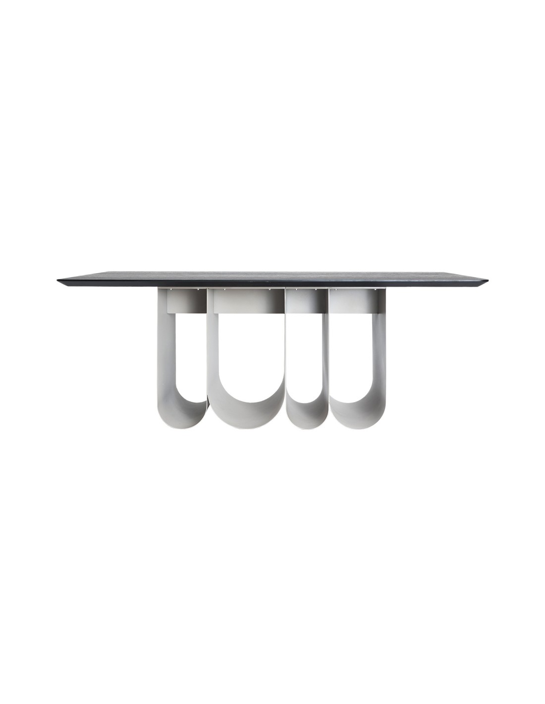 Mesa comedor Arqa de estilo Contemporáneo, fabricada en DM acabado marrón, en combinación con melamina y hierro color gris. Producto desmontable.