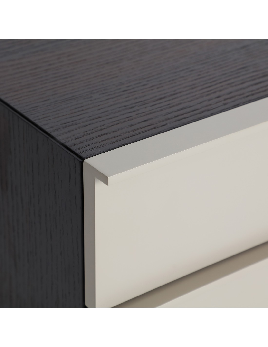 Mesita de noche Lindflur de estilo Contemporáneo, fabricada en DM acabado gris, en combinación con chapa de roble color marrón y hierro.