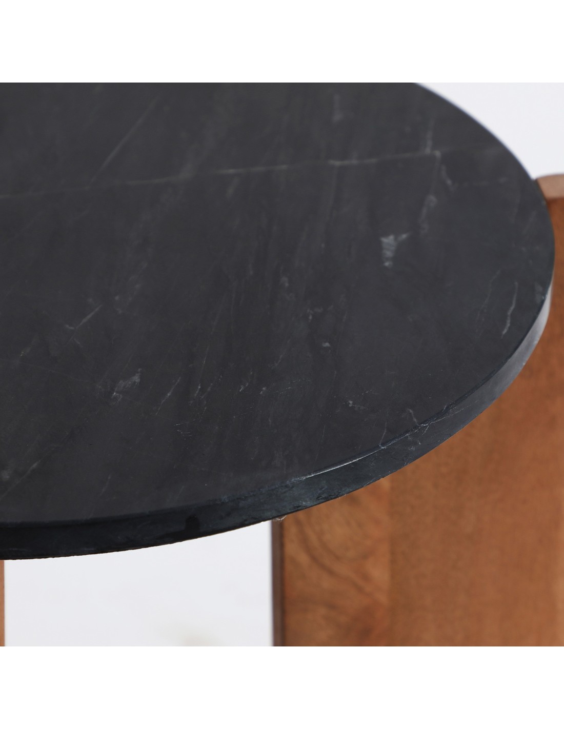 Mesa auxiliar Valigny de estilo Contemporáneo, fabricada en mármol color negro con acabado veteado, en combinación con madera de mango color marrón. Producto desmontable.