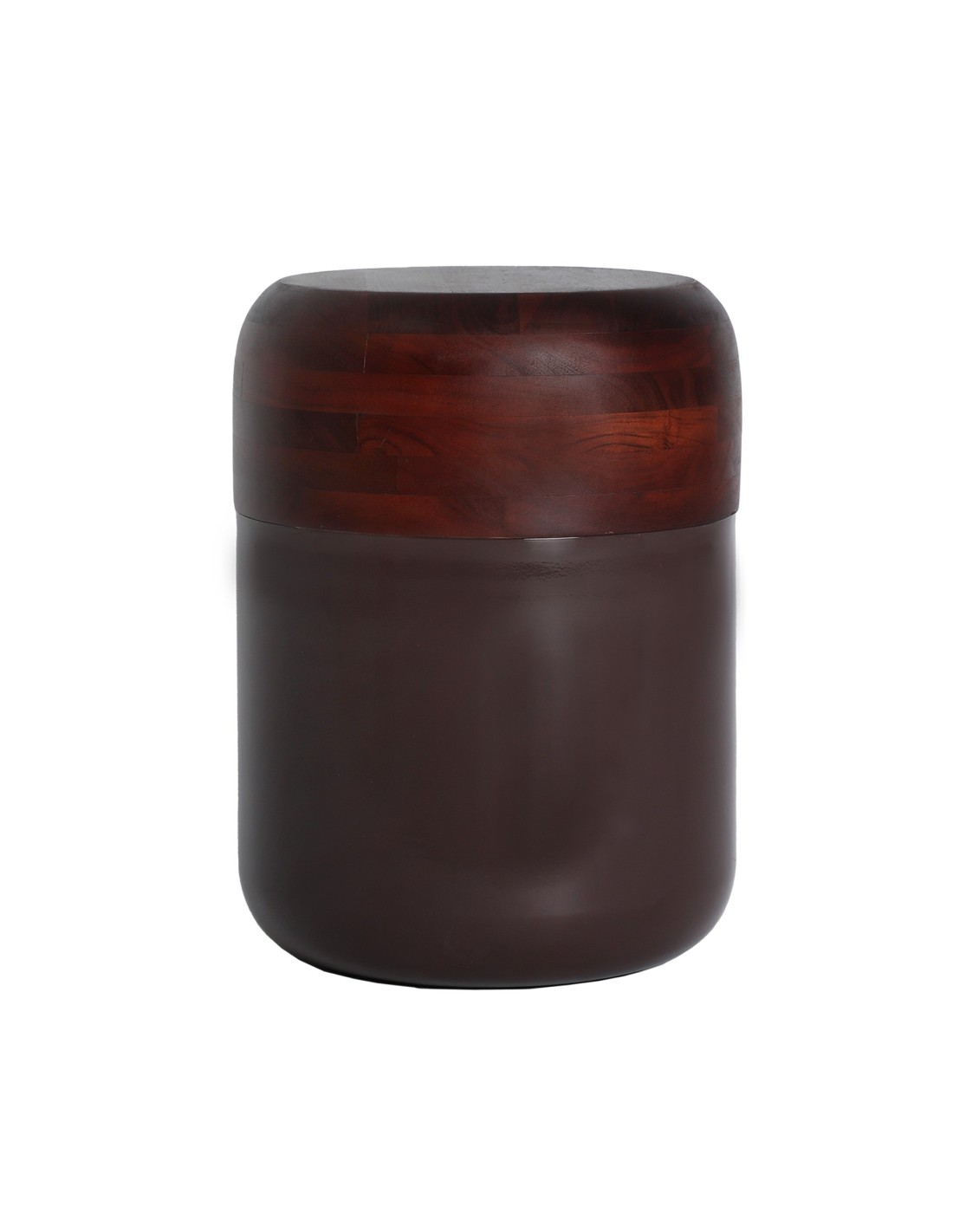 Mesa auxiliar Tau de estilo Contemporáneo, fabricada en hierro color chocolate con acabado brillo, en combinación con madera de acacia color marrón.