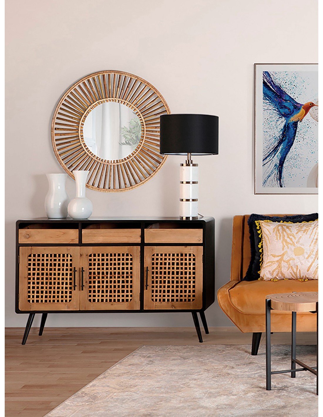 Espejo redondo Arteaga de estilo Contemporáneo, fabricado en bambú en color marrón, combinado con espejo.